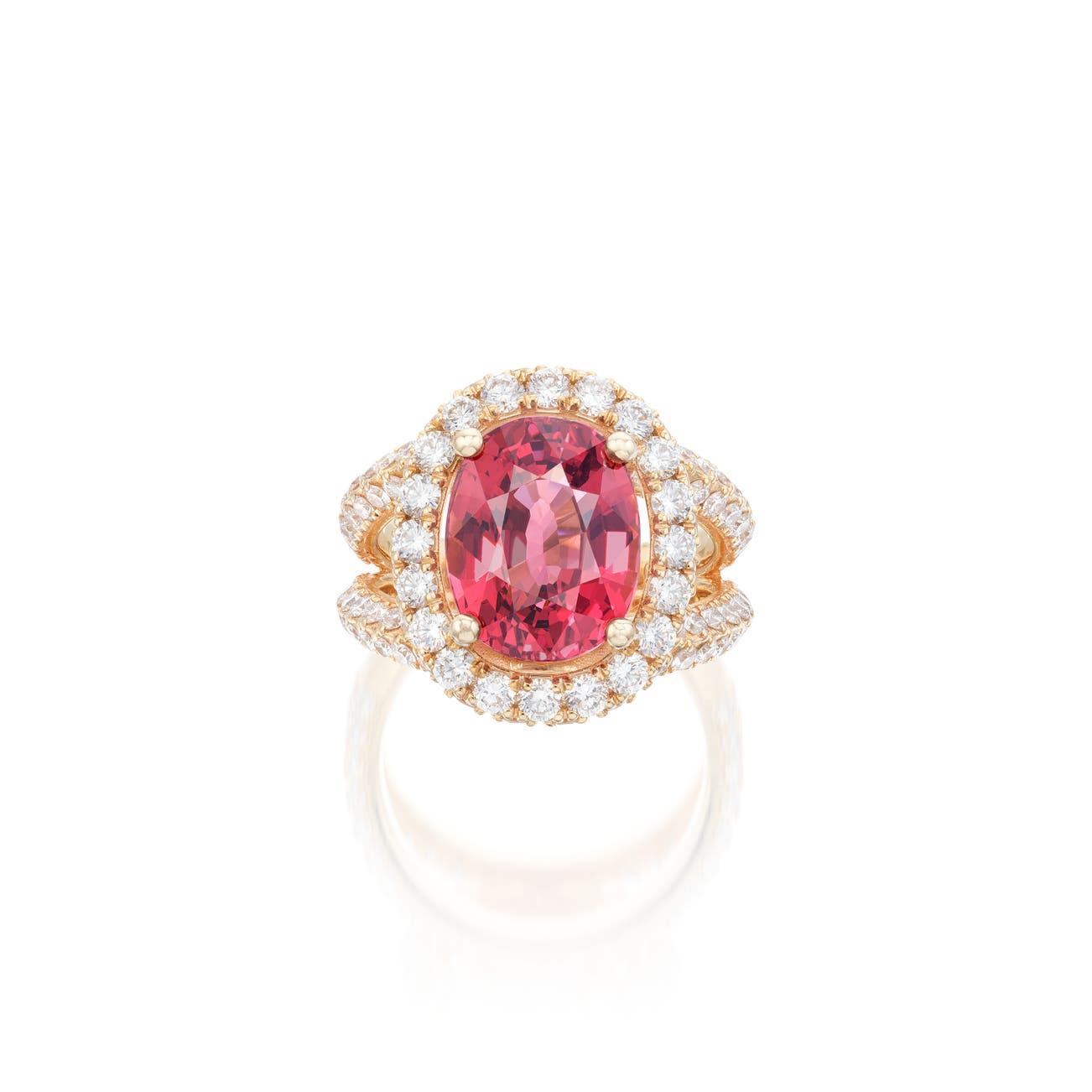 Set with an oval spinel weighing 6.67 carats, to the brilliant-cut diamond surround and bifurcated shoulders, size 6¼.