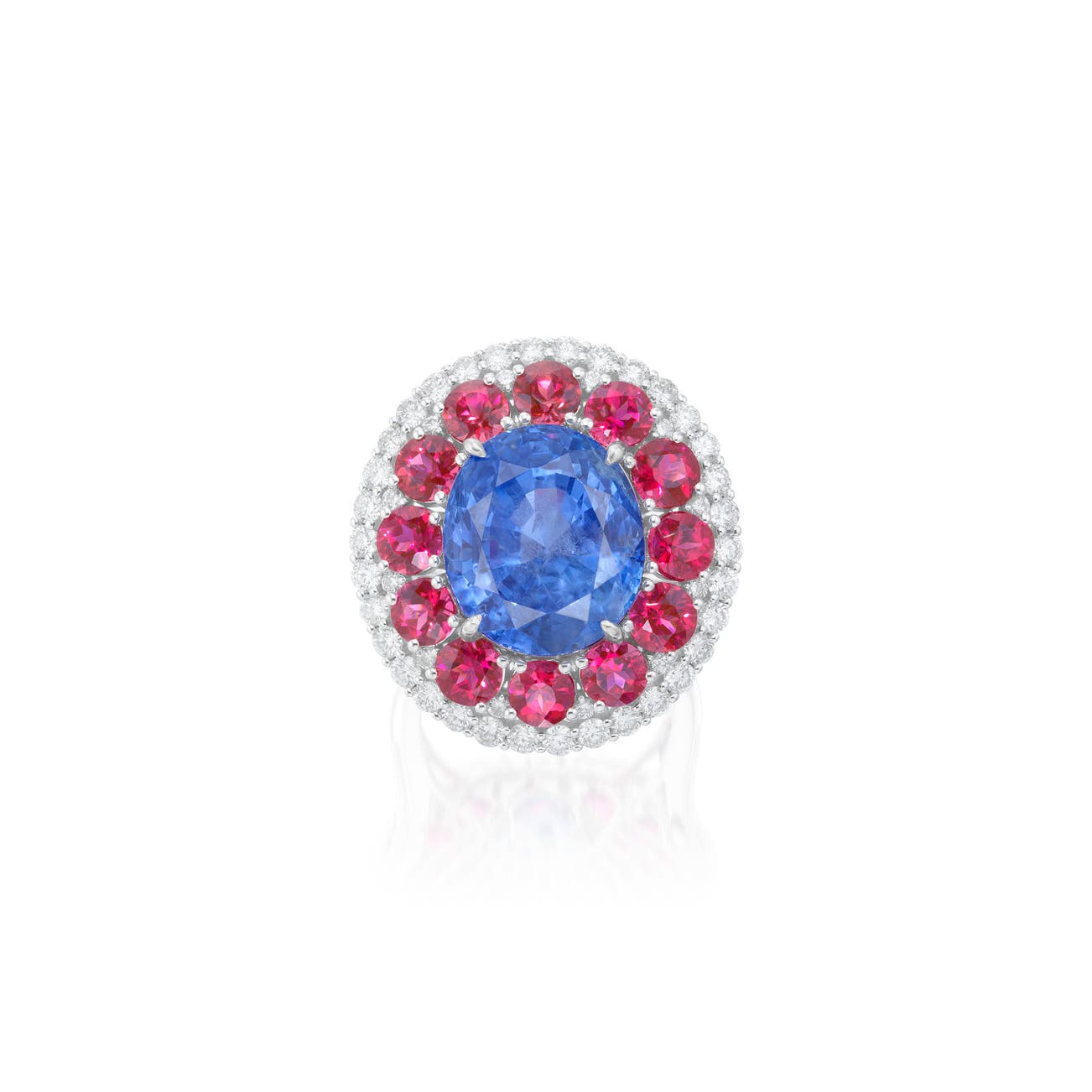 Set with an oval sapphire weighing approximately 14.11 carats, surrounded by circular-cut tourmalines and brilliant-cut diamonds, to the brilliant-cut diamond and circular-cut sapphire shoulders, size 5¾.