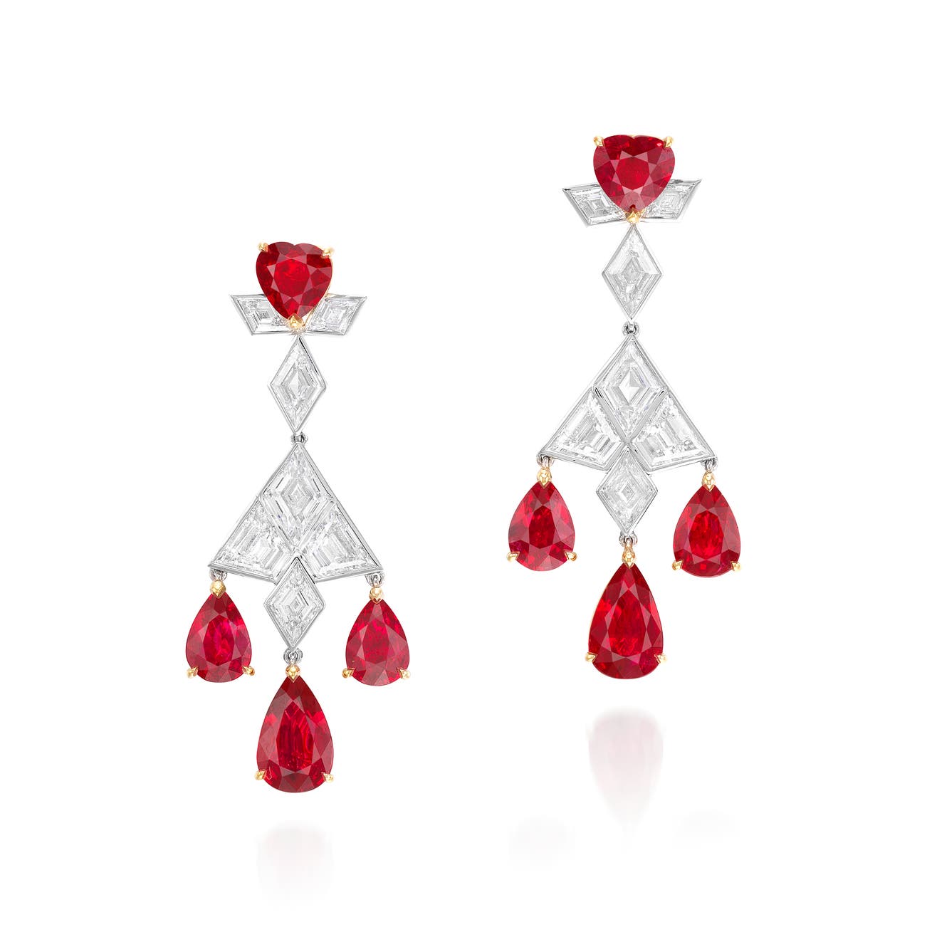 Of chandelier design, each set with pear- and heart-shaped rubies weighing 8.51 carats in total, embellished with kite- and trapezoid-shaped diamonds, post and butterfly fittings, length approximately 43 mm.