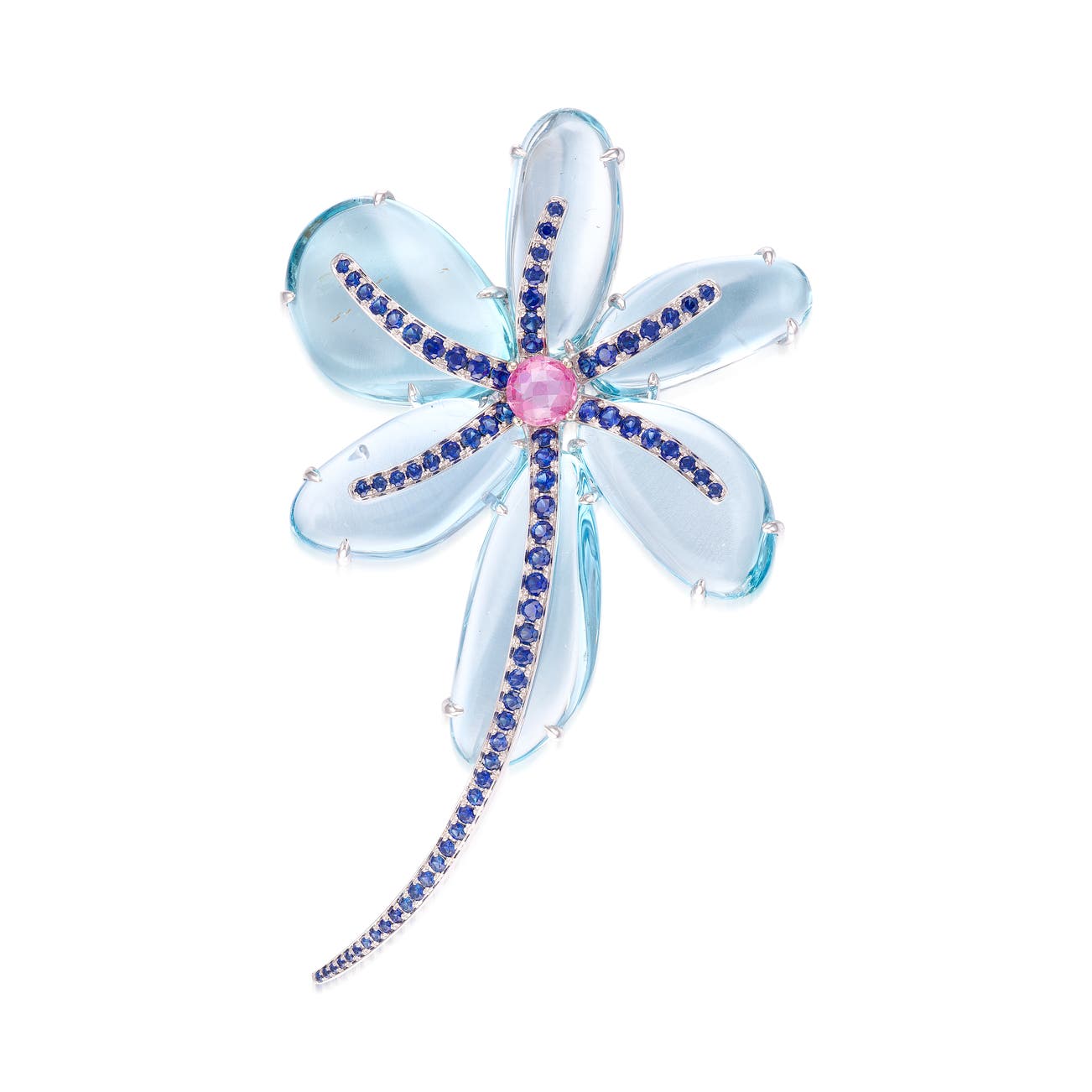 Of floral design, the petals set with pebble-shaped aquamarines, centring upon a rose-cut pink sapphire, highlighted with circular-cut sapphires, measuring approximately 83 x 47 mm.