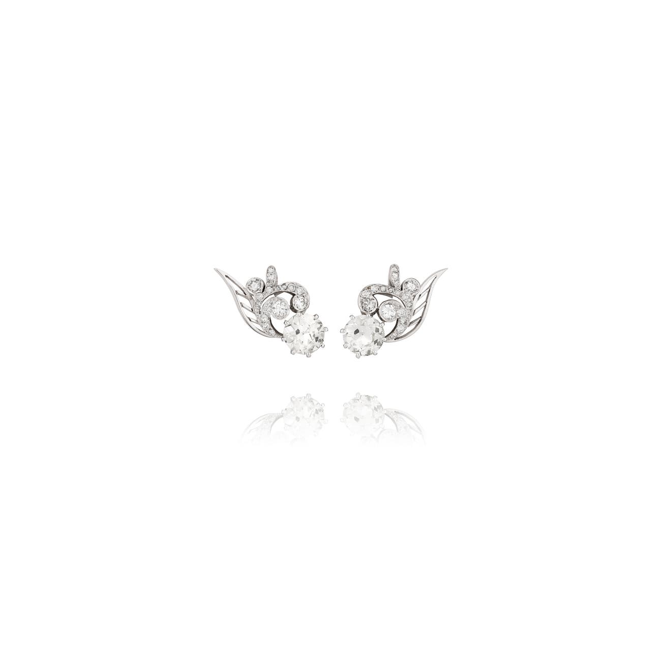 Of foliate design, each set with a circular-cut diamond weighing 2.76 and 2.77 carats respectively, and circular- and single-cut diamonds, each measuring 3 x 1.5mm, screw-back fittings, security chain.