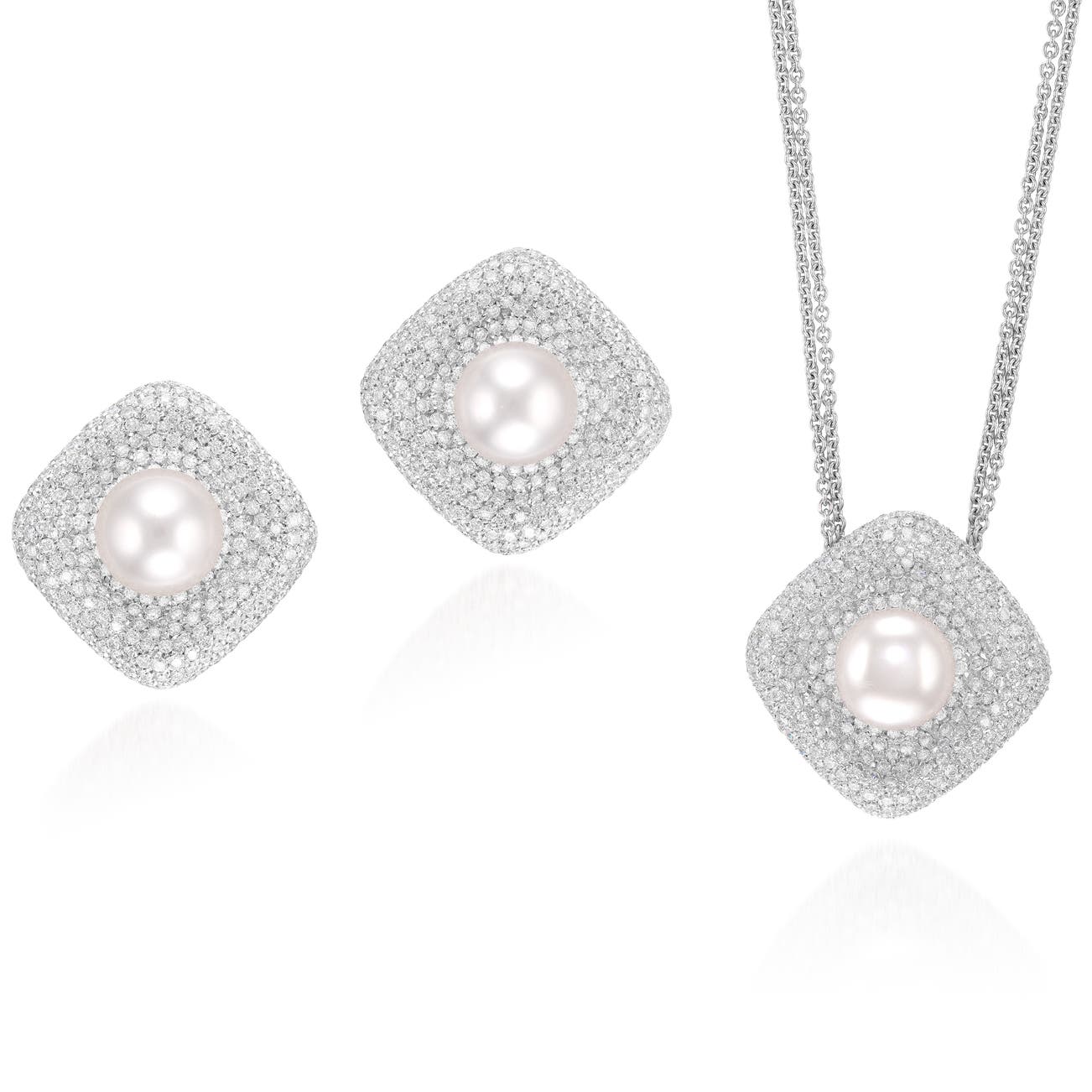 Comprising: a pendent necklace, set with a button-shaped cultured pearl measuring approximately 11.04 x 10.86 mm, to a white gold link chain; and a pair of earrings en suit, each set with a slightly button-shaped cultured pearl measuring approximately 11.76 mm and 11.33 mm, all with Italian assay and maker's mark, earrings with collapsible post and hinged back fittings, pendant, link chain and earrings length approximately 27, 437 and 27 mm respectively.