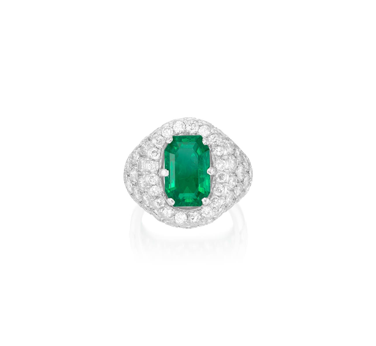Set with an step-cut emerald weighing 4.38 carats, decorated with brilliant- and single-cut diamonds, size 8.