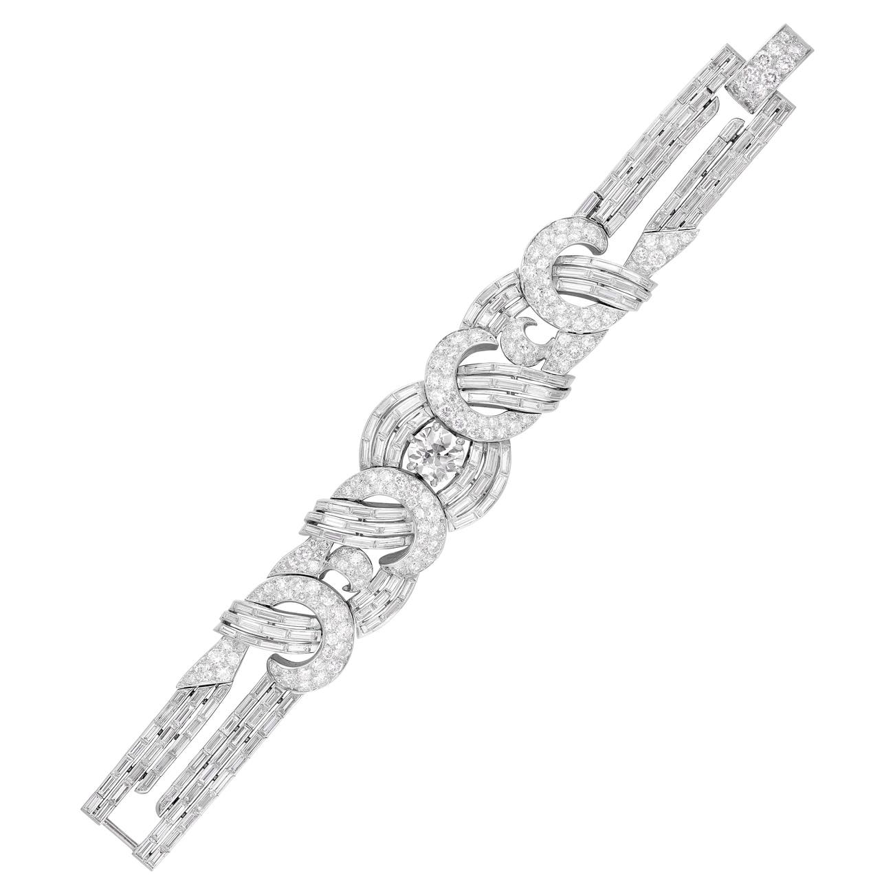 Of scroll design, set with brilliant-cut and baguette diamonds, French assay and maker's marks, length approximately 160 mm.