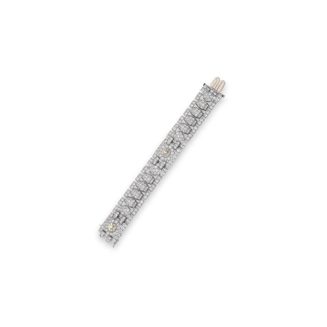 Of geometric design, set throughout with circular- and single-cut diamonds, accented with two circular-cut diamonds of yellow tint, length approximately 180mm, French maker's mark and assay mark for platinum and gold.