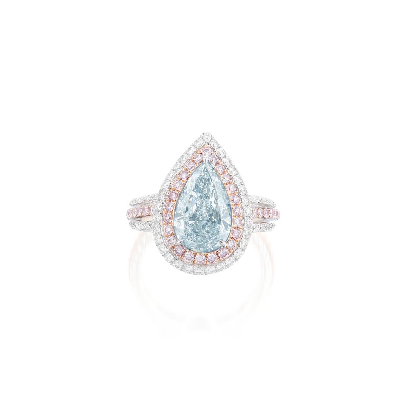 Set with a pear-shaped light blue diamond weighing 2.59 carats, to the brilliant-cut diamond and diamond of pink tint surround and shoulders, size 5½.