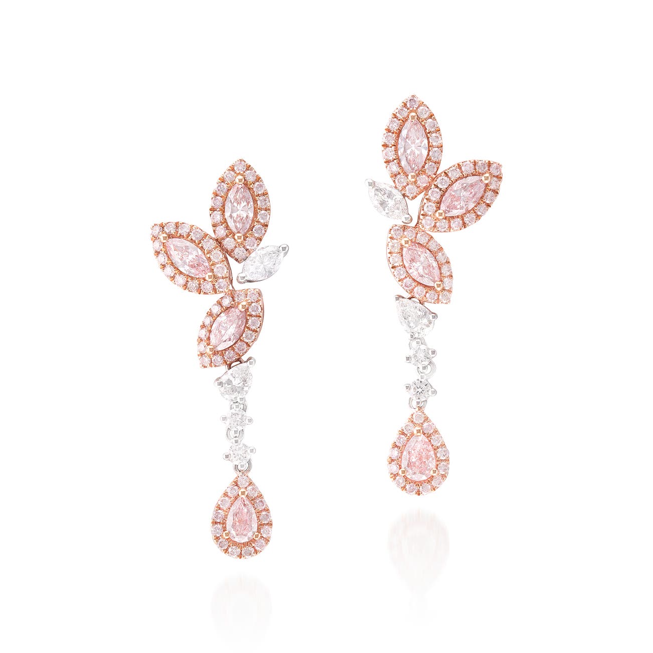 Each suspending a pendant, set with marquise-, pear-shaped and brilliant-cut diamonds and diamonds of pink tint, post and butterfly fittings, length approximately 36 mm.