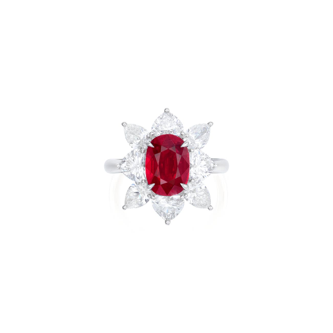 Set with an oval ruby weighing 3.04 carats, to the heart- and pear-shaped diamond surround, size 6½.