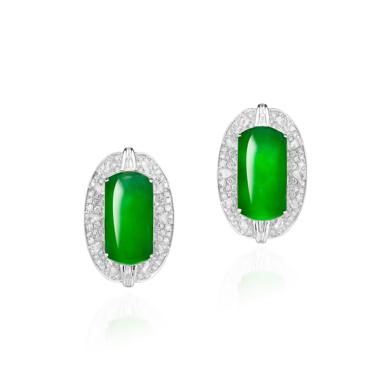 Each set with a jadeite saddle-top measuring approximately 15.87 x 8.06 x 3.85 mm and 15.55 x 7.98 x 4.00 mm respectively, of bright green colour and very good translucency, to the rose-, brilliant-cut and tapered baguette surround, post and hinged back fittings, length approximately 22 mm.