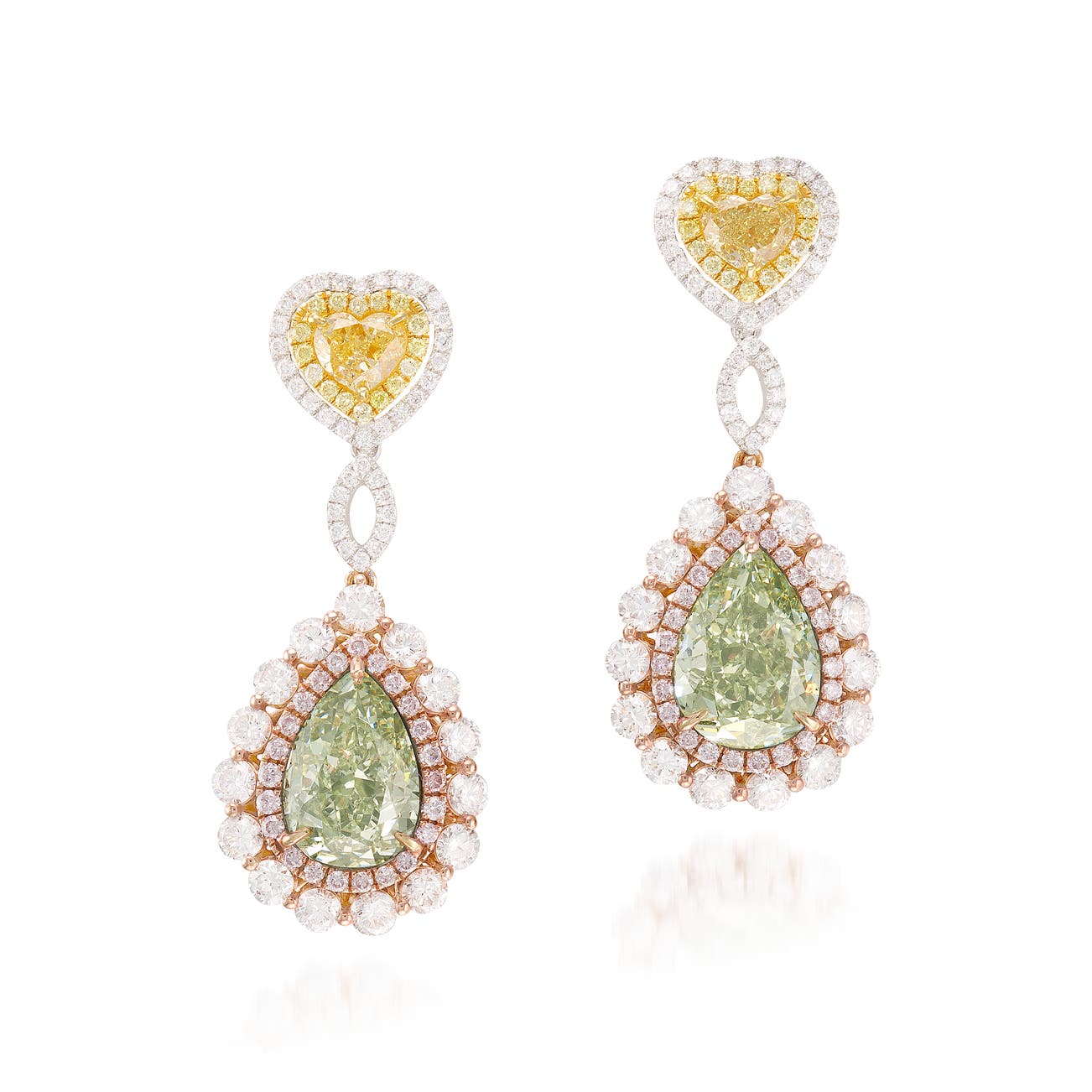 Each set with pear- and heart-shaped coloured diamonds weighing from 3.52 to 0.45 carats, surrounded by brilliant-cut diamonds and diamonds of pink and yellow tint, post and butterfly fittings, length approximately 34 mm.