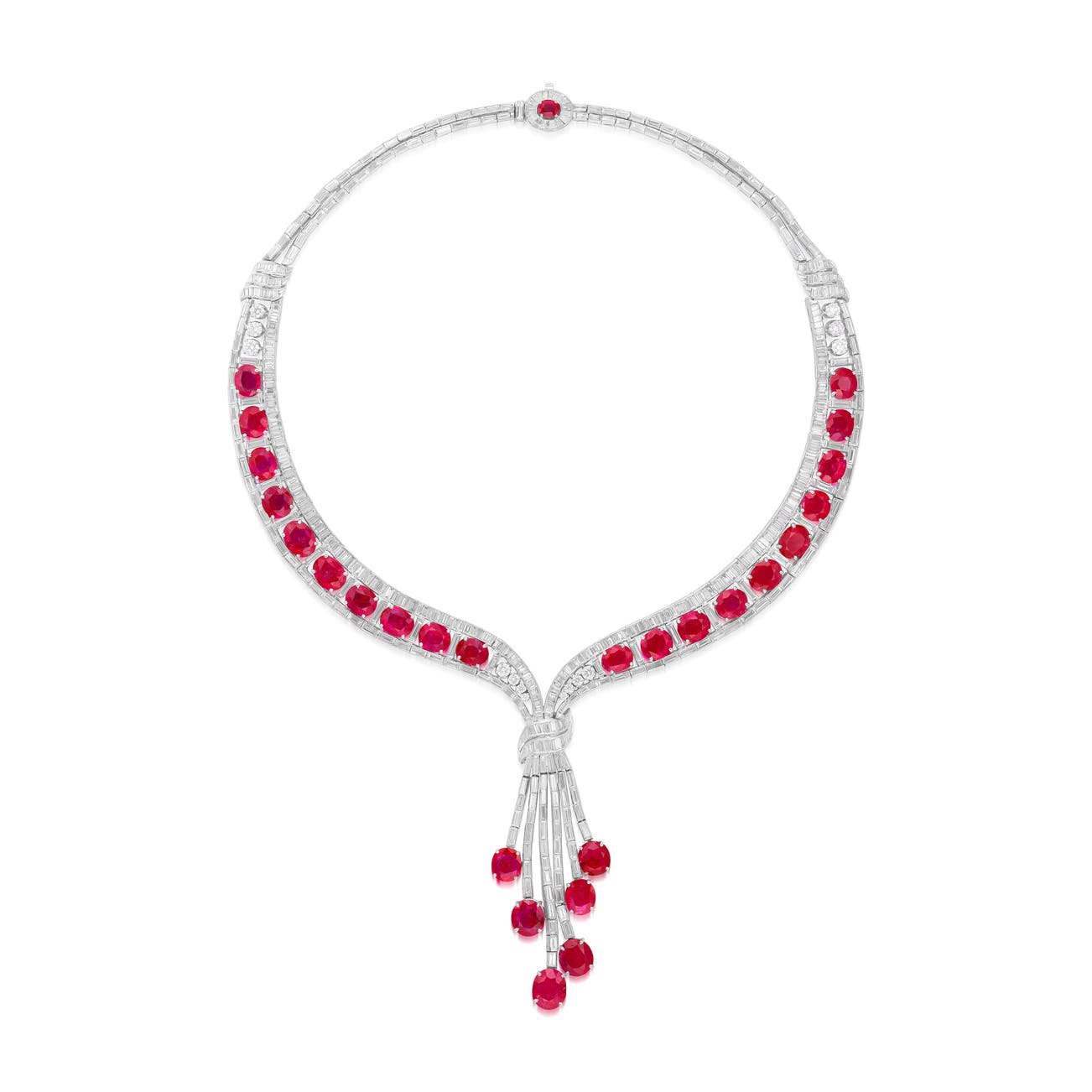 Designed as an articulated necklace gathered to the front suspending a tassel, set with twenty-seven oval and cushion-shaped rubies weighing approximately 40.00 carats in total, embellished with baguette, tapered baguette and brilliant-cut diamonds, length approximately 400 mm.