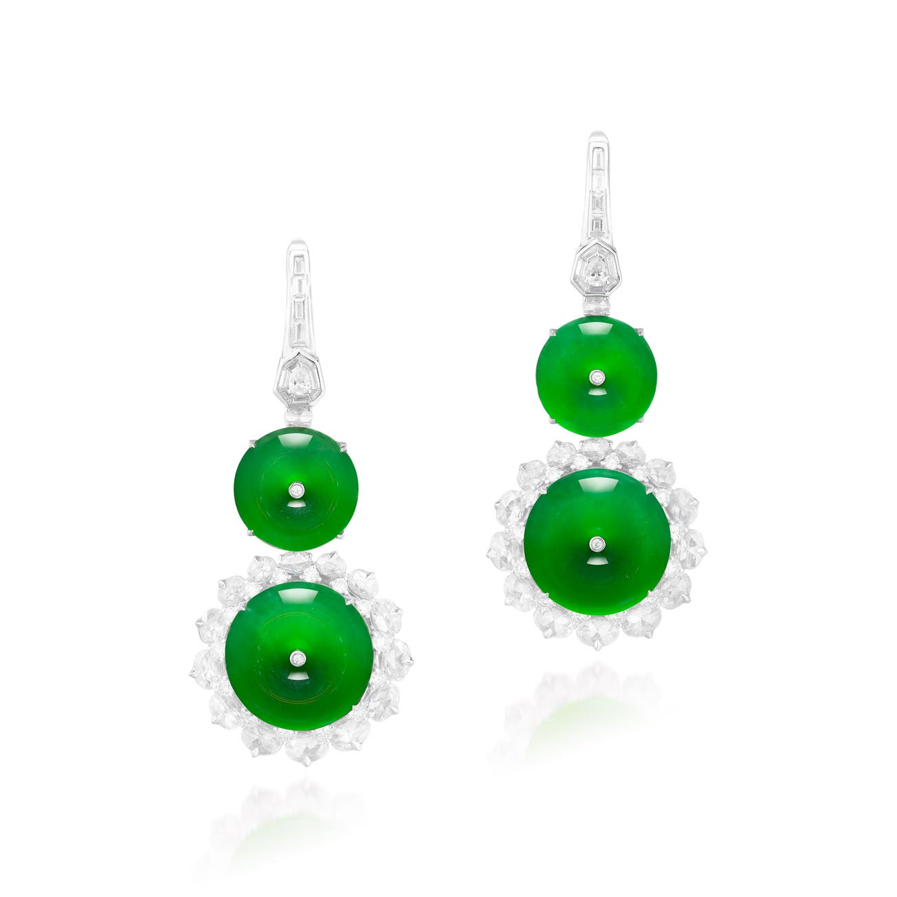 Each suspending two jadeite huaigu measuring approximately from 14.03-14.08 x 3.38 to 11.53-11.73 x 3.20 mm, of bright green colour and very good translucency, to the rose- and brilliant-cut diamond surround and diamond-set surmount, post and hinged back fittings, length approximately 48 mm.