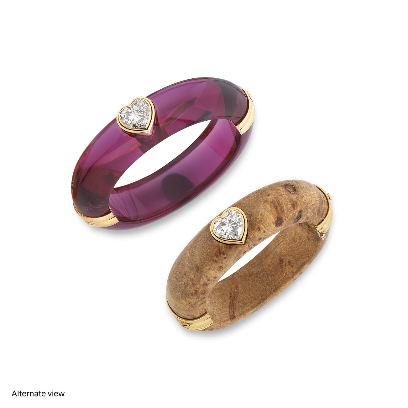 A wood bangle set with a heart-shaped diamond weighing 5.30 carats, accompanied by six interchangeable hinged bangles in translucent acrylic, the bangles are presented in a spectrum of colours including orange, red, clear, green, purple and black, inner circumference approximately 164mm, Italian assay marks.