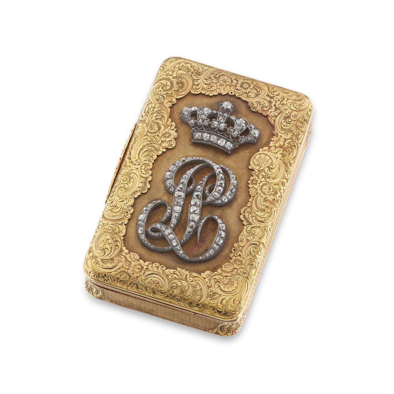 Of rectangular shape, the hinged cover applied with 'LP' monogram of Louis-Philippe d'Orléans, King of the French from 1830 to 1848, surmounted by a royal crown, set with circular-, single- and rose-cut diamonds, the boarders intricately engraved with floral, foliate and scroll motifs, the reverse and sides further decorated with engine turned engraving, measuring approximately 85 x 53mm, numbered, French maker's mark for Alexandre Raoul Morel and assay mark for gold.