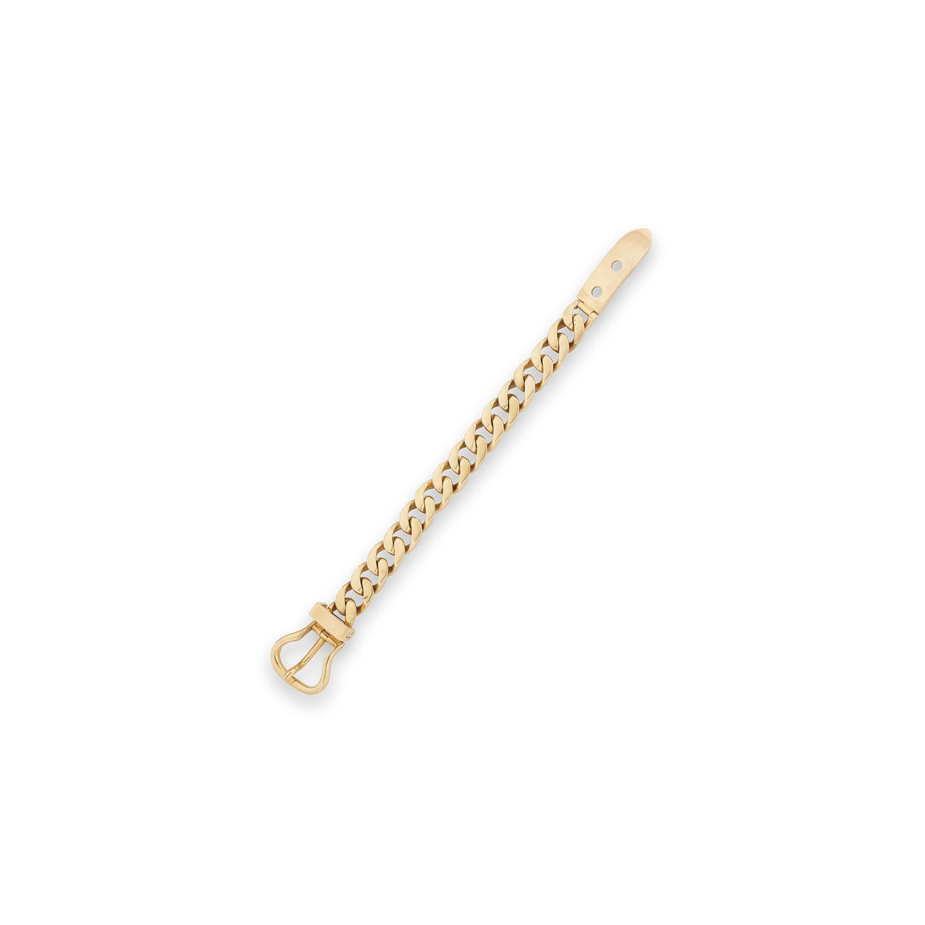 Composed of flat curb links, terminating to a buckle, shortest length approximately 200mm, longest length approximately 215mm.
