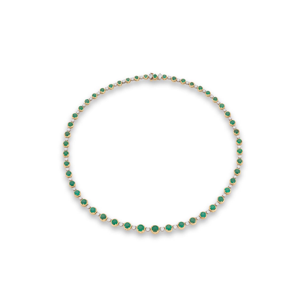 Designed as a line of circular-cut emeralds alternating with brilliant-cut diamonds, with two marquise-shaped diamond accents, length approximately 470mm, numbered.