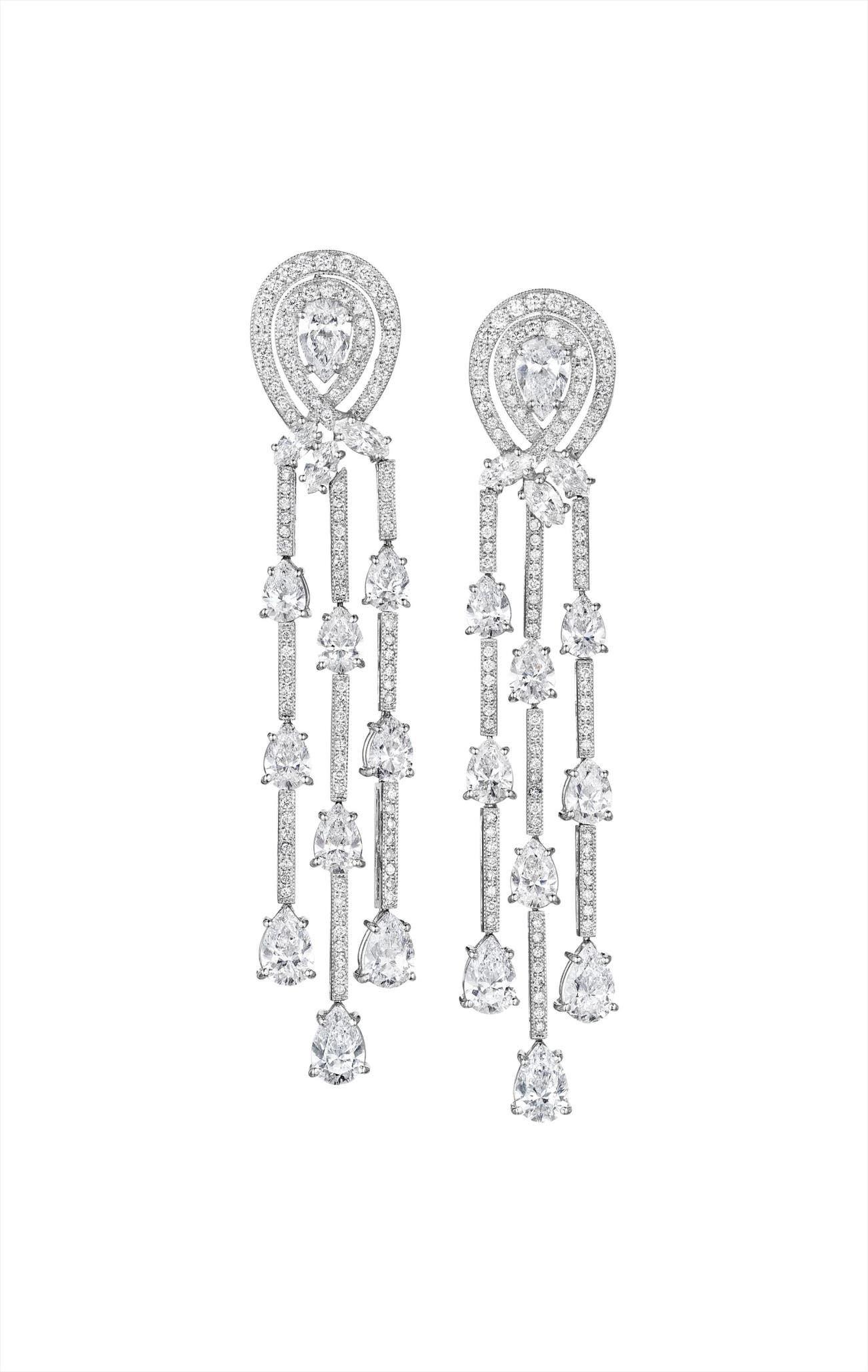 Each designed as a pavé-set diamond surmount, centering on a pear-shaped diamond, suspending three rows of alternating pavé-set diamond links and pear-shaped diamonds, mounted in platinum, length 2 3/4 inches.