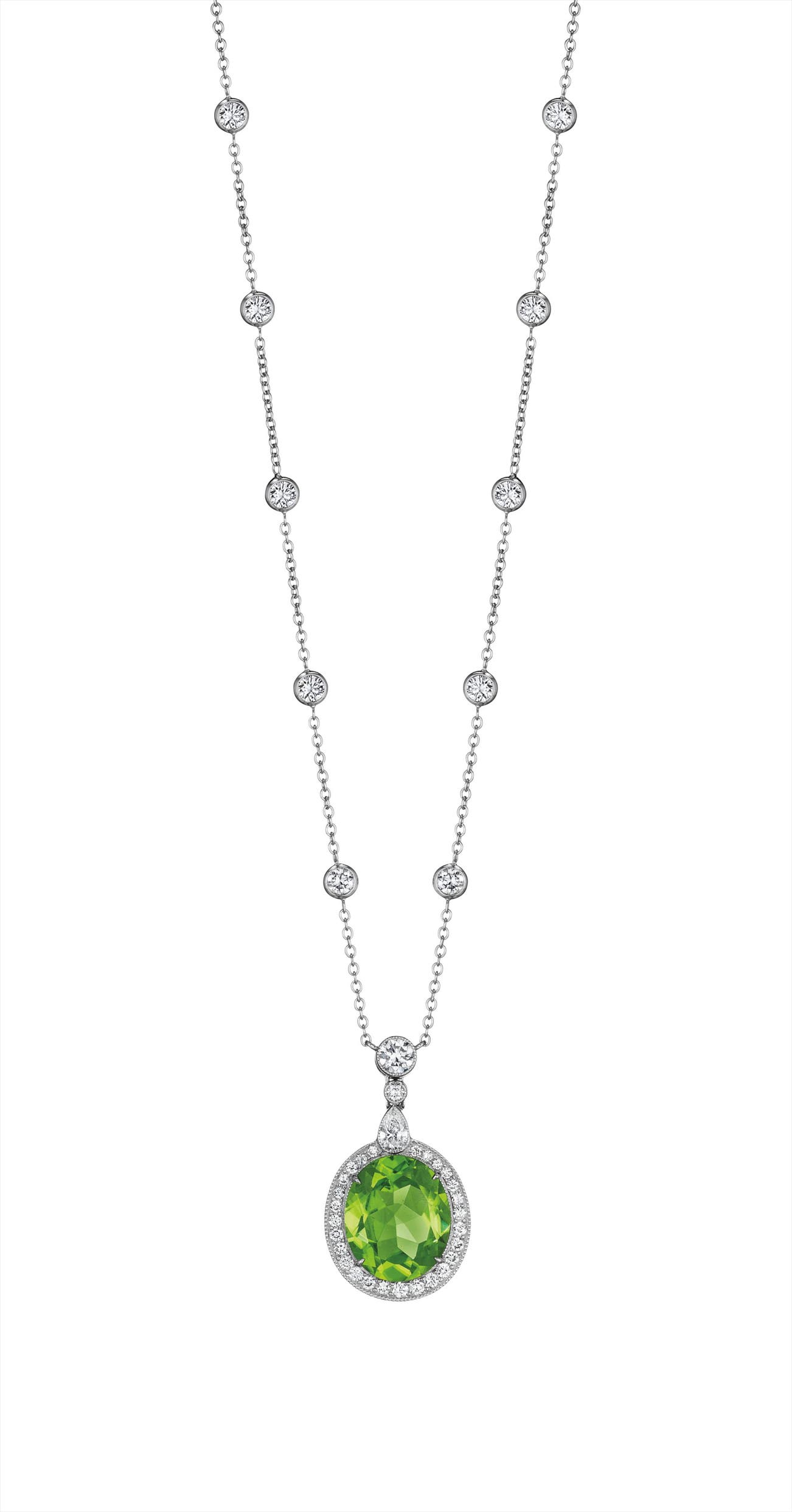 Suspending an oval-cut peridot, weighing approximately 4.29 carats, within a pavé-set diamond surround, to the collet-set pear-shaped and circular-cut diamond surmount, from a fine link chain accented by spectacle-set diamonds, mounted in platinum, length 16 1/2 inches.