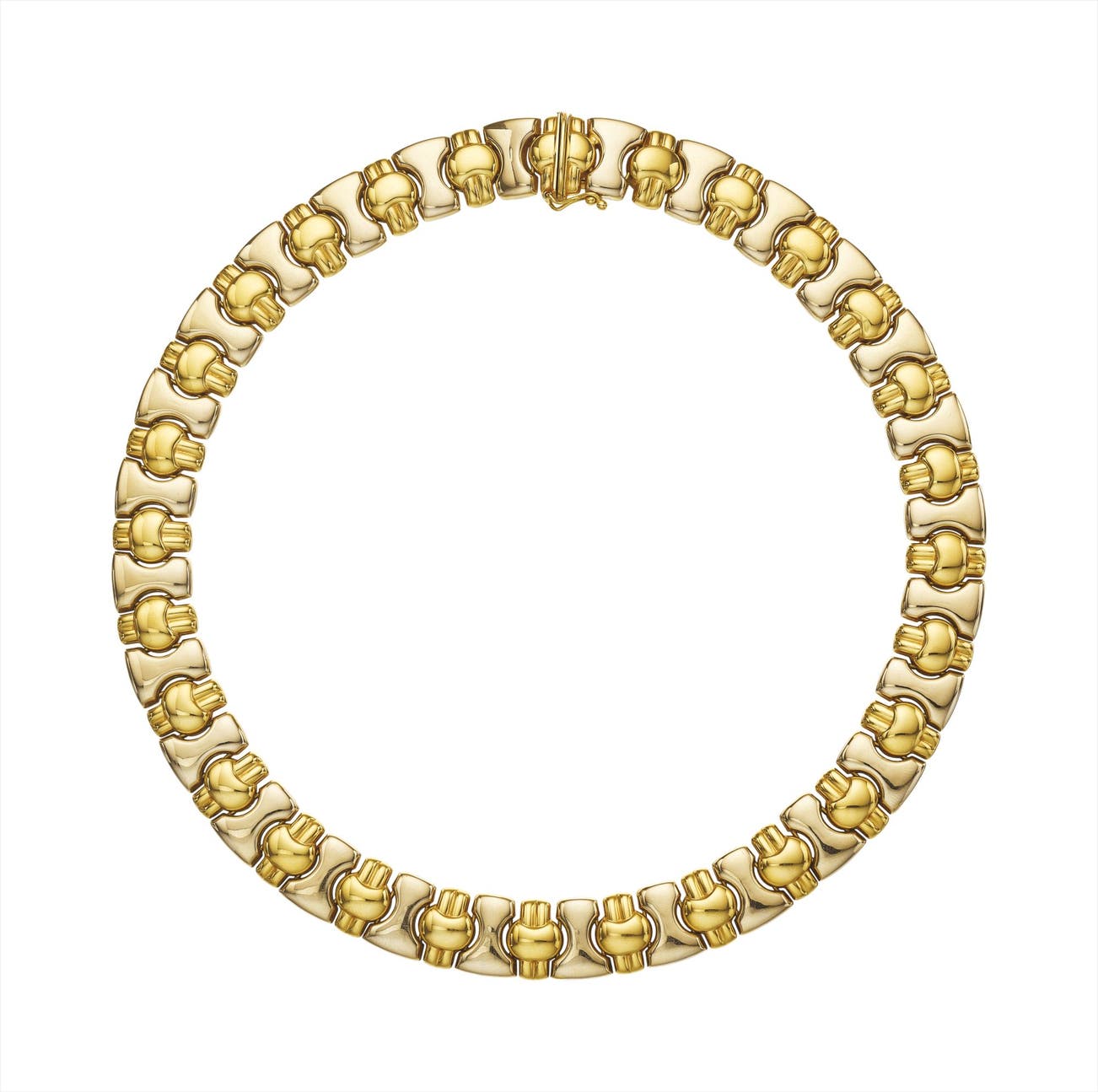 Designed as a series of alternating fluted polished gold links, mounted in 14K yellow gold, length 17 inches.