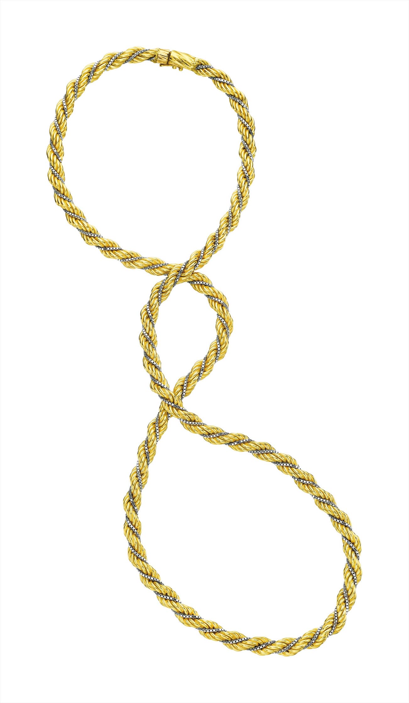 Designed as a double rope-twist chain, mounted in 18K yellow gold, length 28 inches.