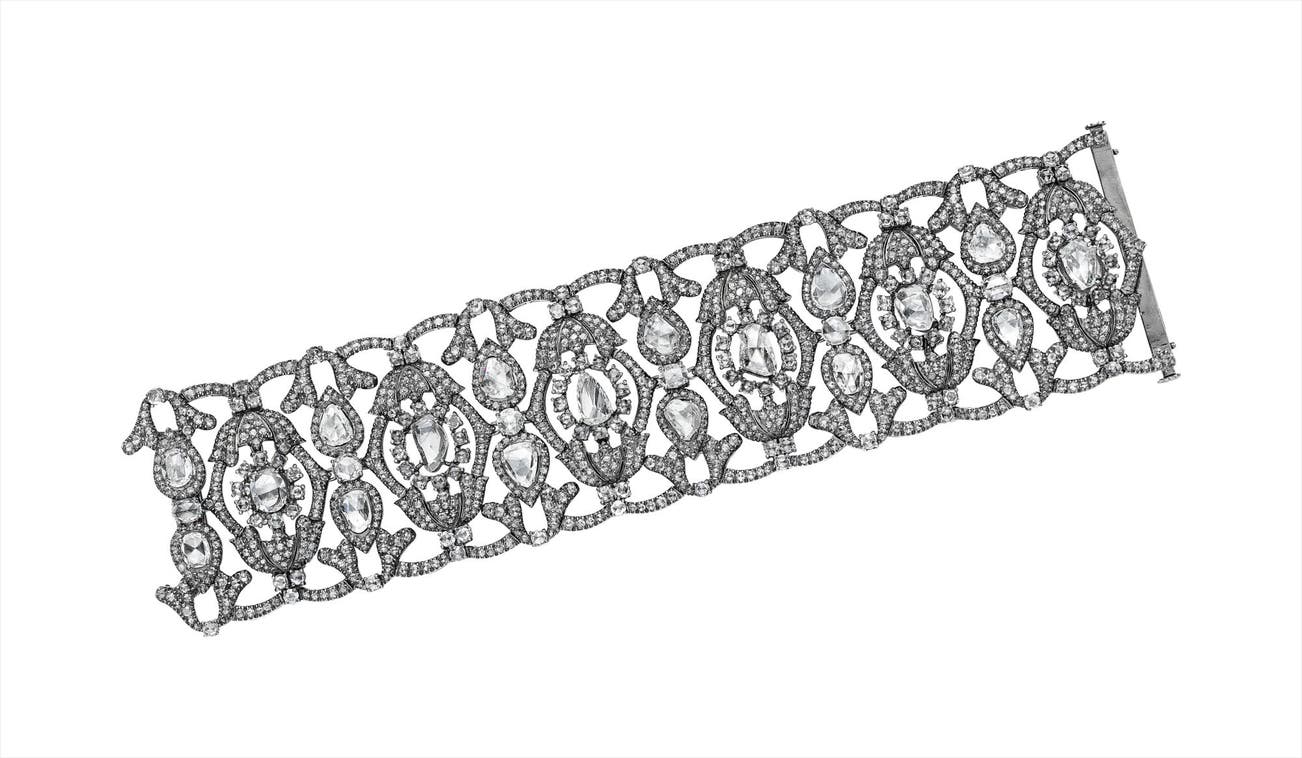 Of openwork design, composed of pavé-set rose-cut diamond plaques, centering on vari-cut diamonds, to the similarly set rose-cut diamond spacers and pavé-set rose-cut diamond borders, mounted in 18K gold, length 6 1/2 inches.