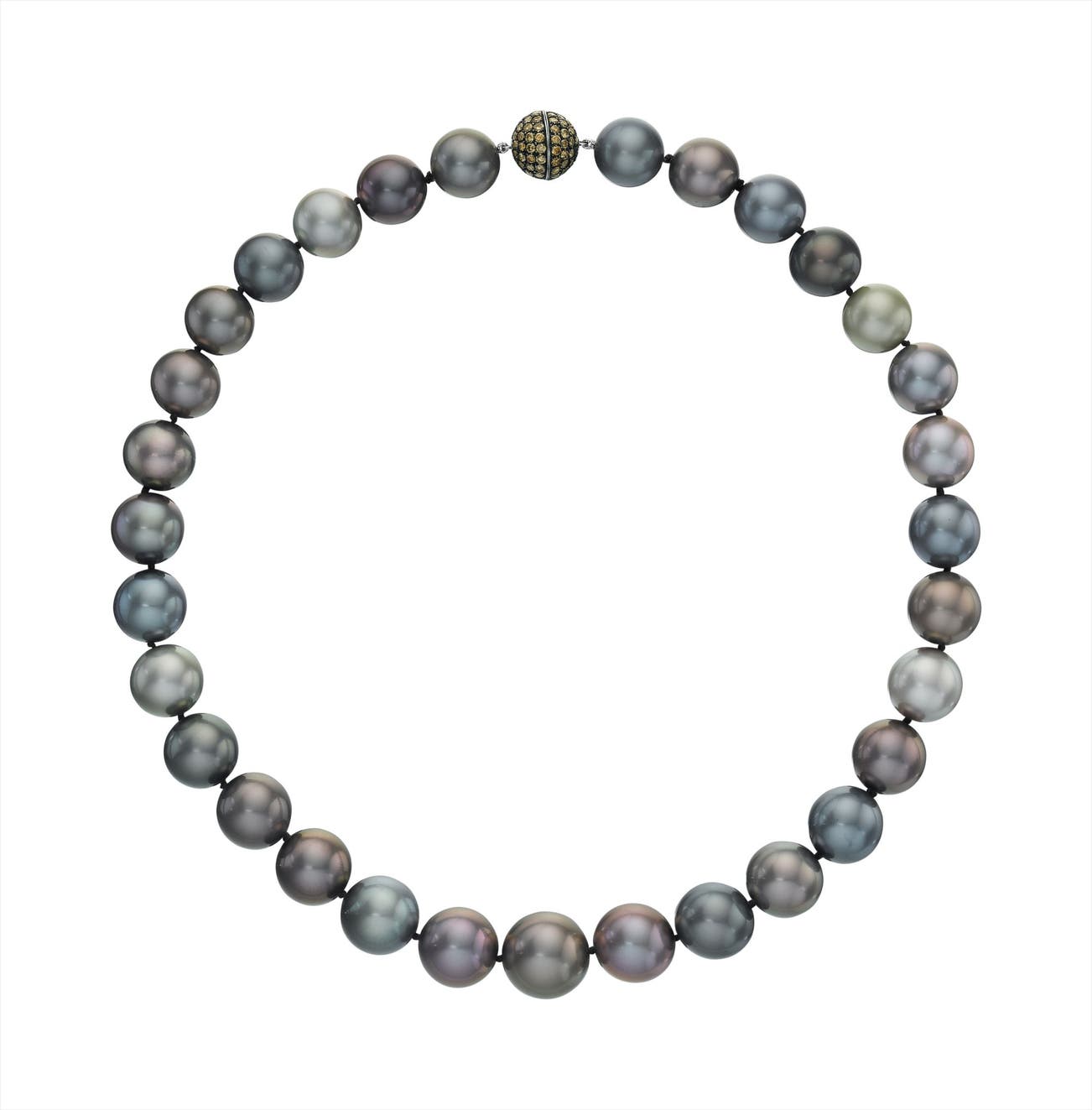 Of thirty-one cultured pearls, measuring from approximately 12.95 to 15.86 mm, joined by a pavé-set diamond sphere clasp, mounted in 18K white gold, length 18 1/2 inches.
