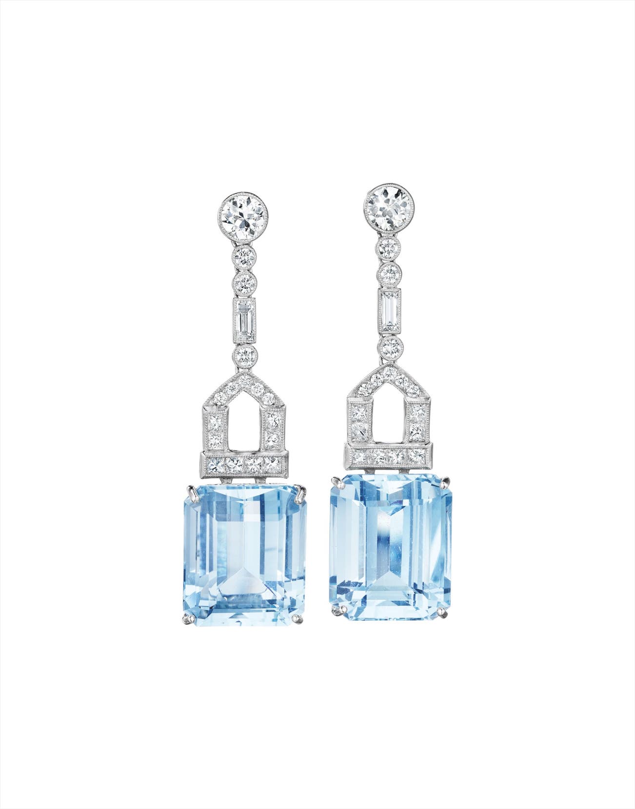 Each suspending a rectangular-cut aquamarine, weighing approximately 30.45 carats in total, from a square and circular-cut pavé-set diamond link, to the collet-set circular-cut diamond surmount, mounted in platinum, length 2 inches.