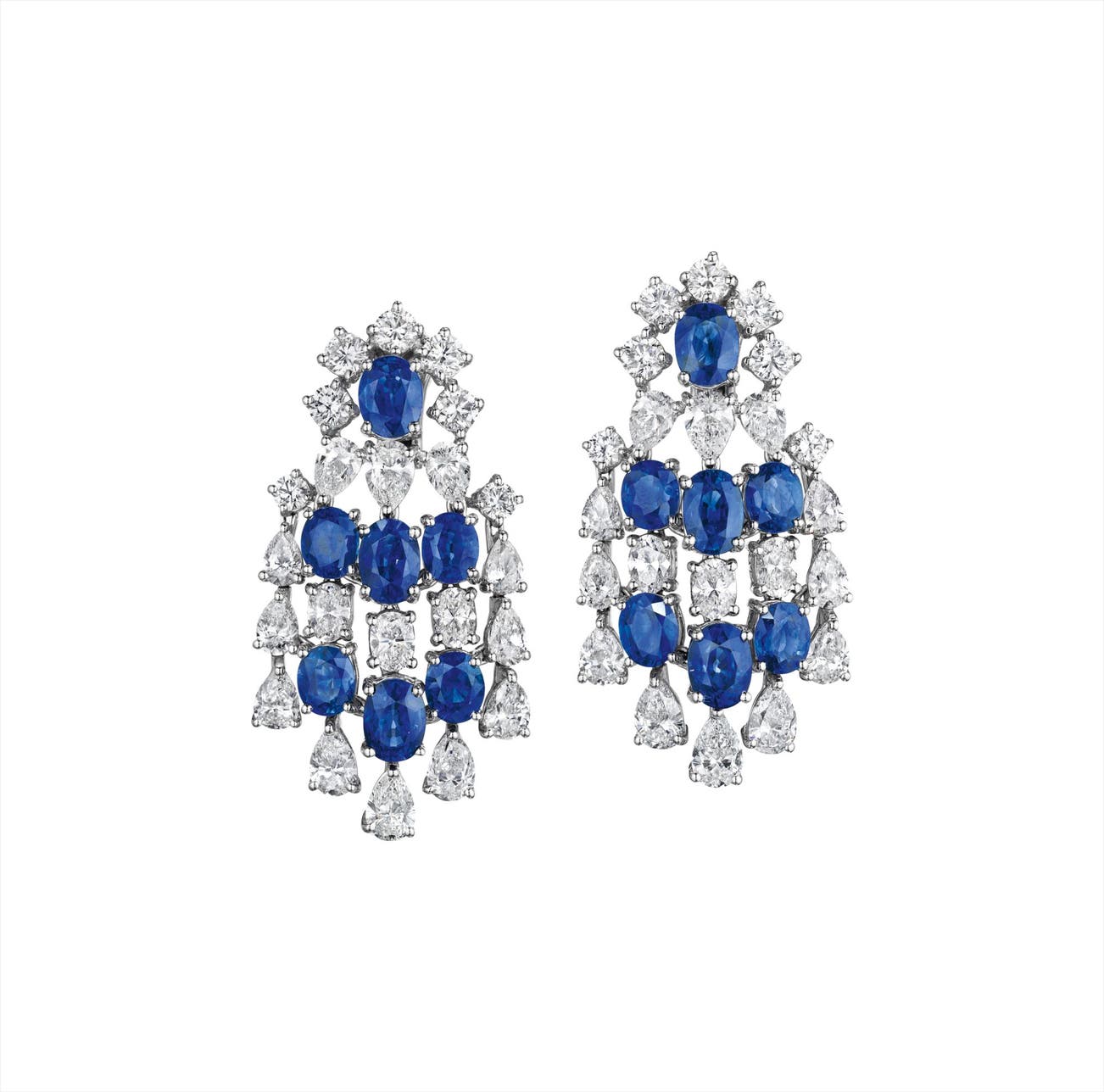 Each designed as a vari-cut diamond graduating cascade, accented by oval-cut sapphires, mounted in 18K white gold, length 1 3/4 inches.