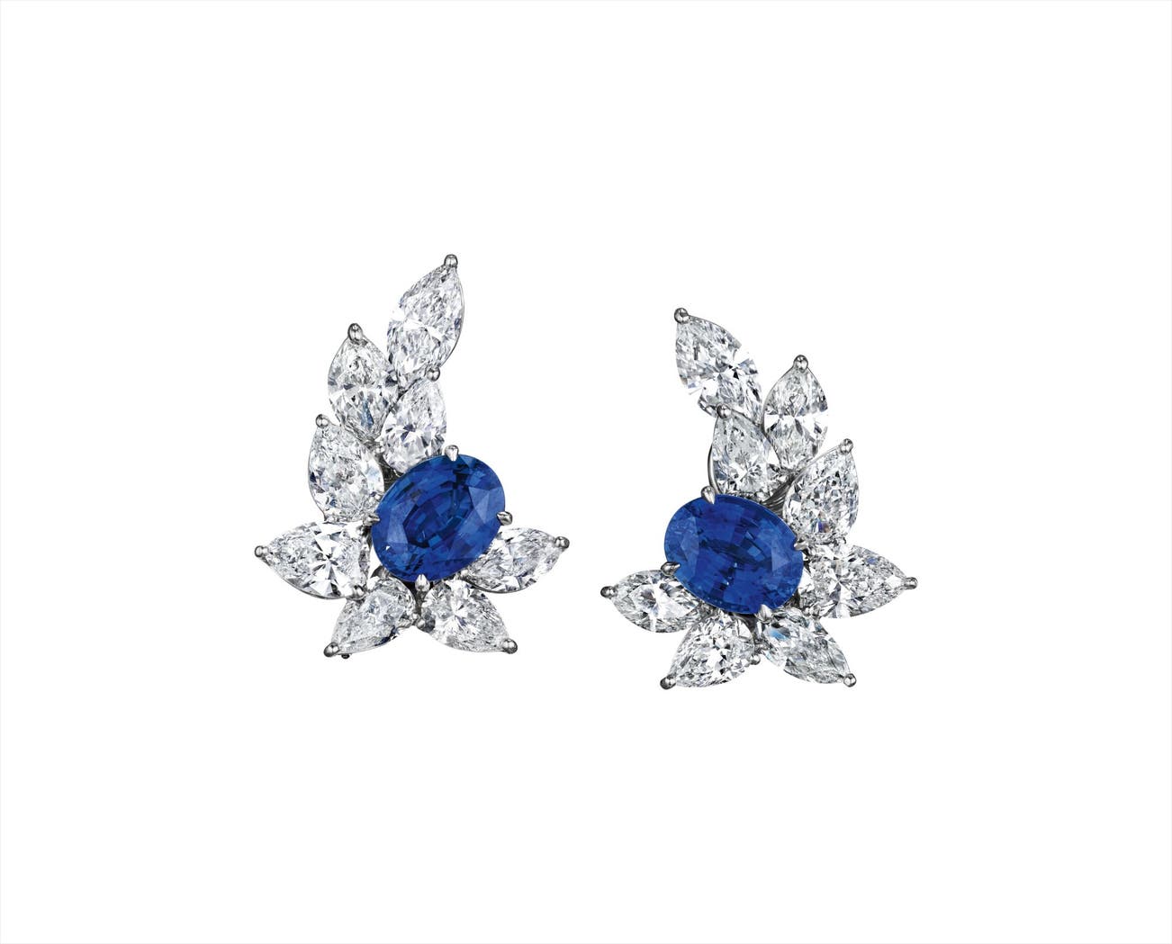Each centering on an oval-cut sapphire, weighing approximately 12.22 carats in total, within a pear-shape and marquise-cut diamond cluster surround, weighing approximately 16.76 carats in total, mounted in 18K white gold, length 1 3/8 inches.