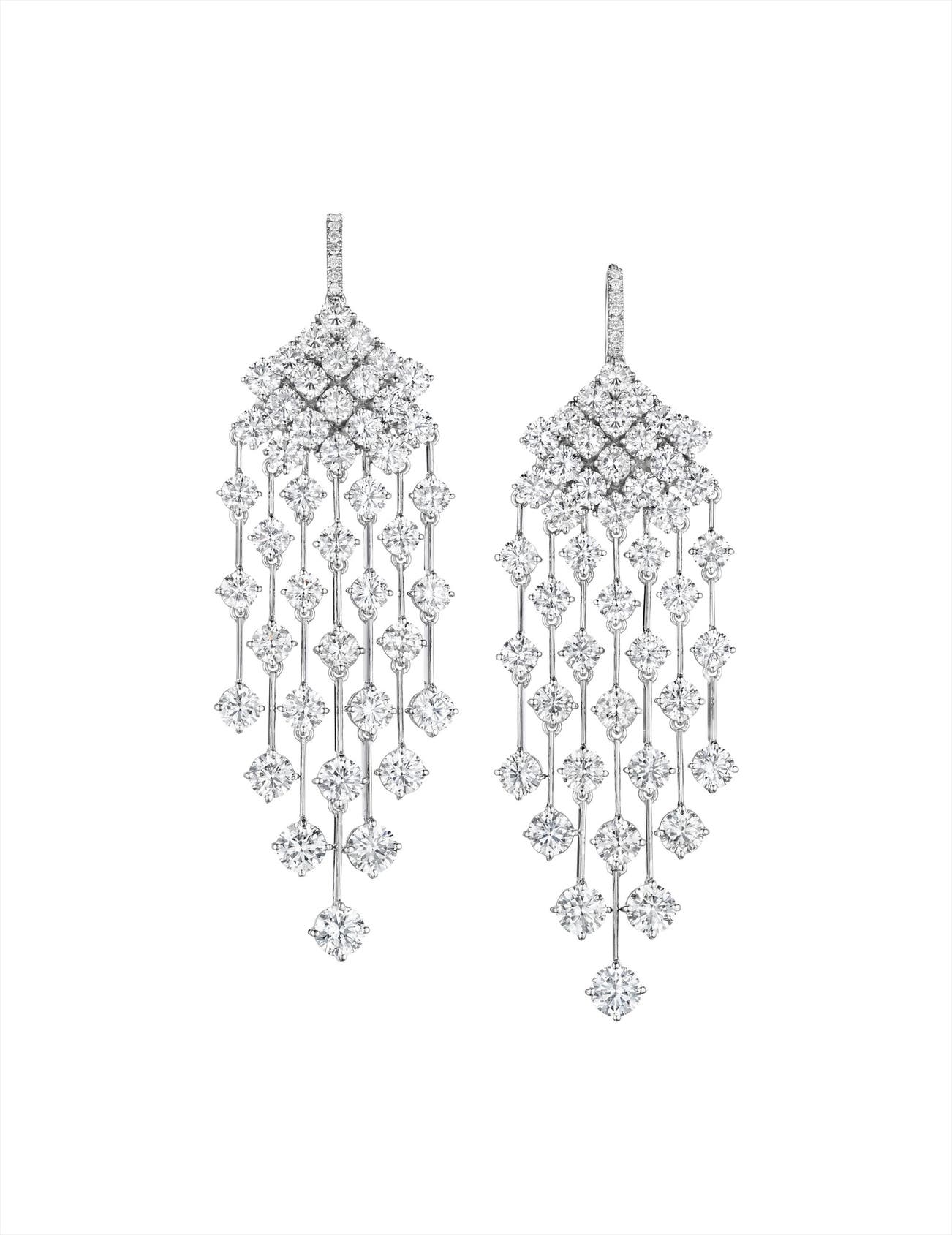 Each designed as a circular-cut diamond cascade, to the pavé-set diamond half hoop, mounted in 18K white gold, length 2 4/5 inches.