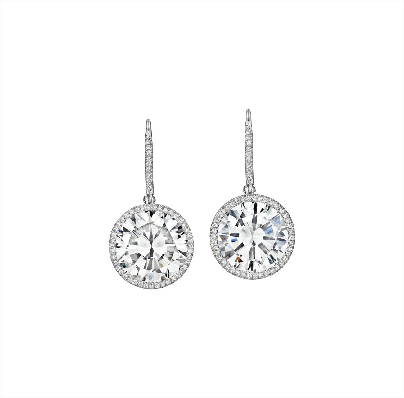Each suspending a circular-cut diamond, weighing approximately 7.02 and 8.05 carats, within a pavé-set diamond surround, from a pavé-set diamont surmount, mounted in 18K white gold, length 1 1/4 inches.