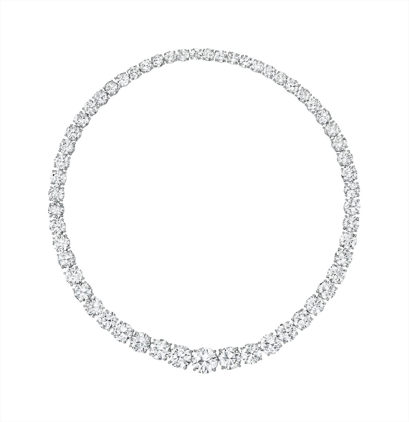 Designed as a graduate rivière necklace, composed of fifty-seven diamonds, weighing approximately 70.15 carats in total, mounted in platinum, length 15 1/2 inches.