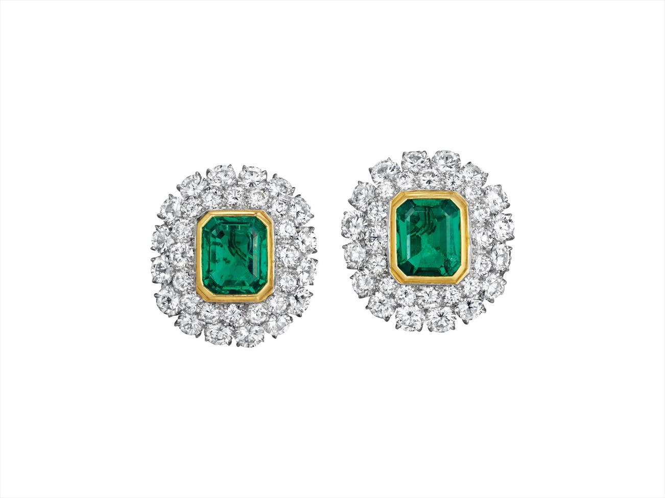 Each set with a rectangular-cut emerald, weighing approximately 6.34 carats in total, within a polished gold frame, to the circular-cut diamond surround, mounted in 18K yellow white gold, length 1 inch.