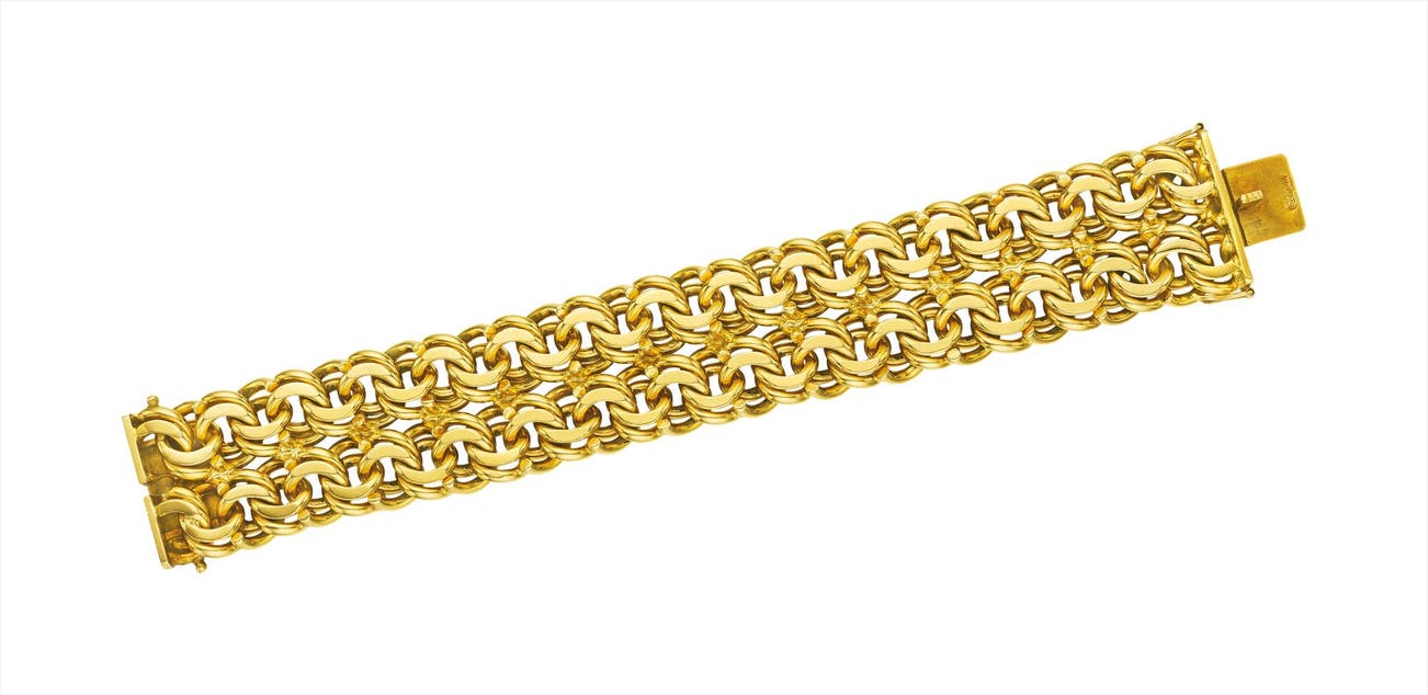 Designed as a wide band composed of a series of flattened polished gold links, mounted in 14K yellow gold, length 7 1/4 inches.