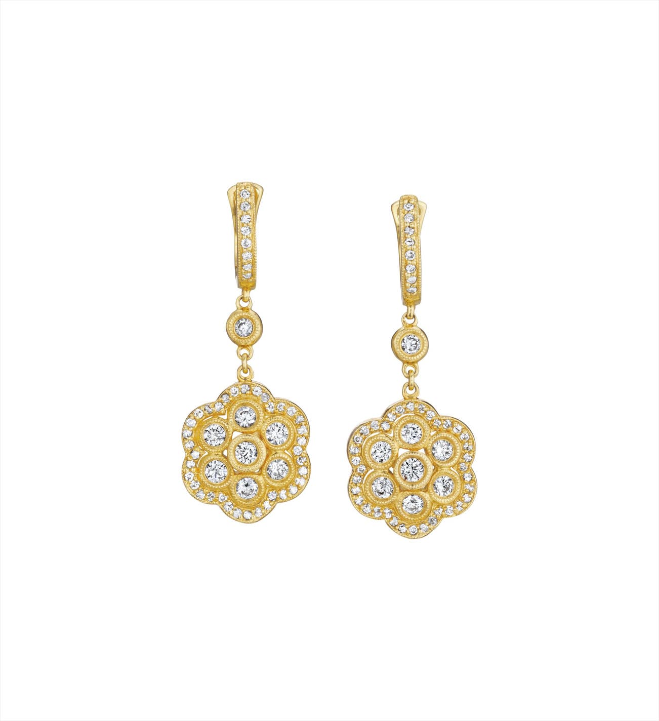 Each suspending a circular-cut diamond floret cluster, within a pavé-set diamond frame, from a collet-set diamond spacer link and pavé-set diamond line surmount, mounted in 14K yellow gold, length 1 1/2 inches.