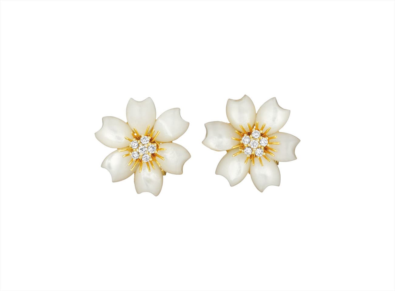 Each designed as a sculpted mother-of-pearl flower, centering on a circular-cut diamond cluster and polished gold detail, mounted in 14K yellow gold, length 7/8 inches.