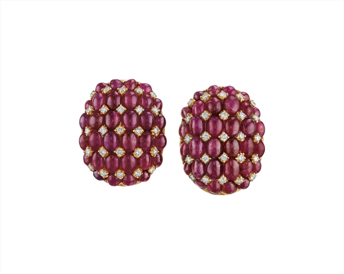 Each designed as a bombé plaque, entirely set with cabochon rubies, weighing approximately 47.58 carats in total, accented by circular-cut diamonds, mounted in 18K yellow gold, length 1 1/8 inches.