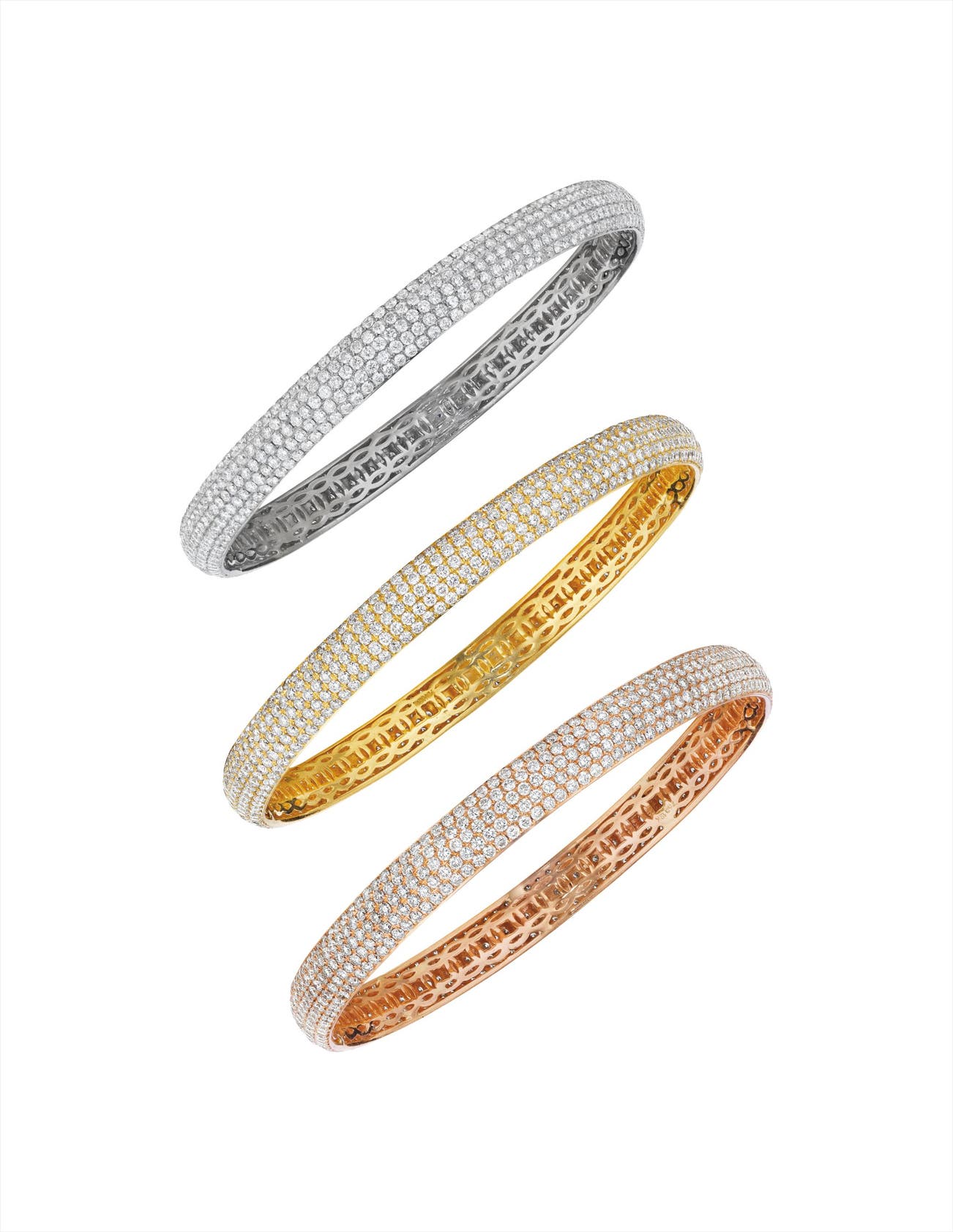 Each designed as a bombé bangle, entirely decorated with circular-cut diamonds, weighing approximately 24.53 carats in total,mounted in 18K rose, white and yellow gold, diameter 2 1/4 inches.