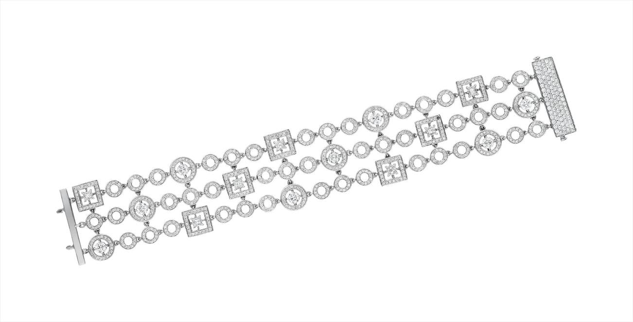 Of flexible design, the wide openwork band composed of three rows of pavé-set diamond circle and square links, accented by square and circular-cut diamonds, to the pavé-set diamond rectangular clasp, mounted in 18K white gold, length 7 1/4 inches.