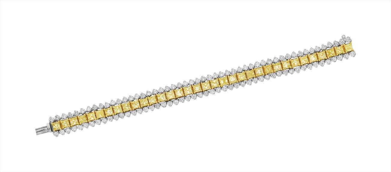 Of highly flexible design, centering on a line of square-cut yellow diamonds, within a circular-cut diamond frame, mounted in 22k yellow gold and platinum, length 7 inches.