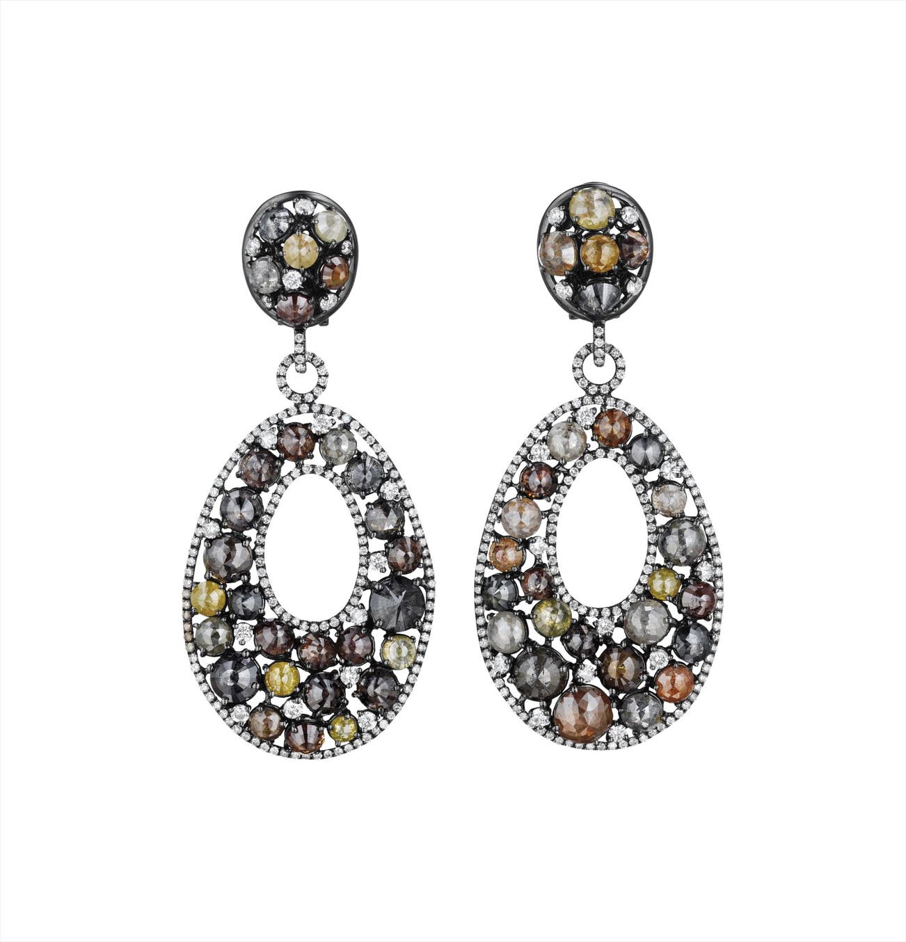 Each suspending a vari-cut colored diamond pear-shaped plaque, within a pavé-set diamond surround and inner ring, from a pavé-set diamond circular link, to the vari-cut colored diamond cluster surmount, mounted in 18K blackened gold, length 2 1/2 inches.
