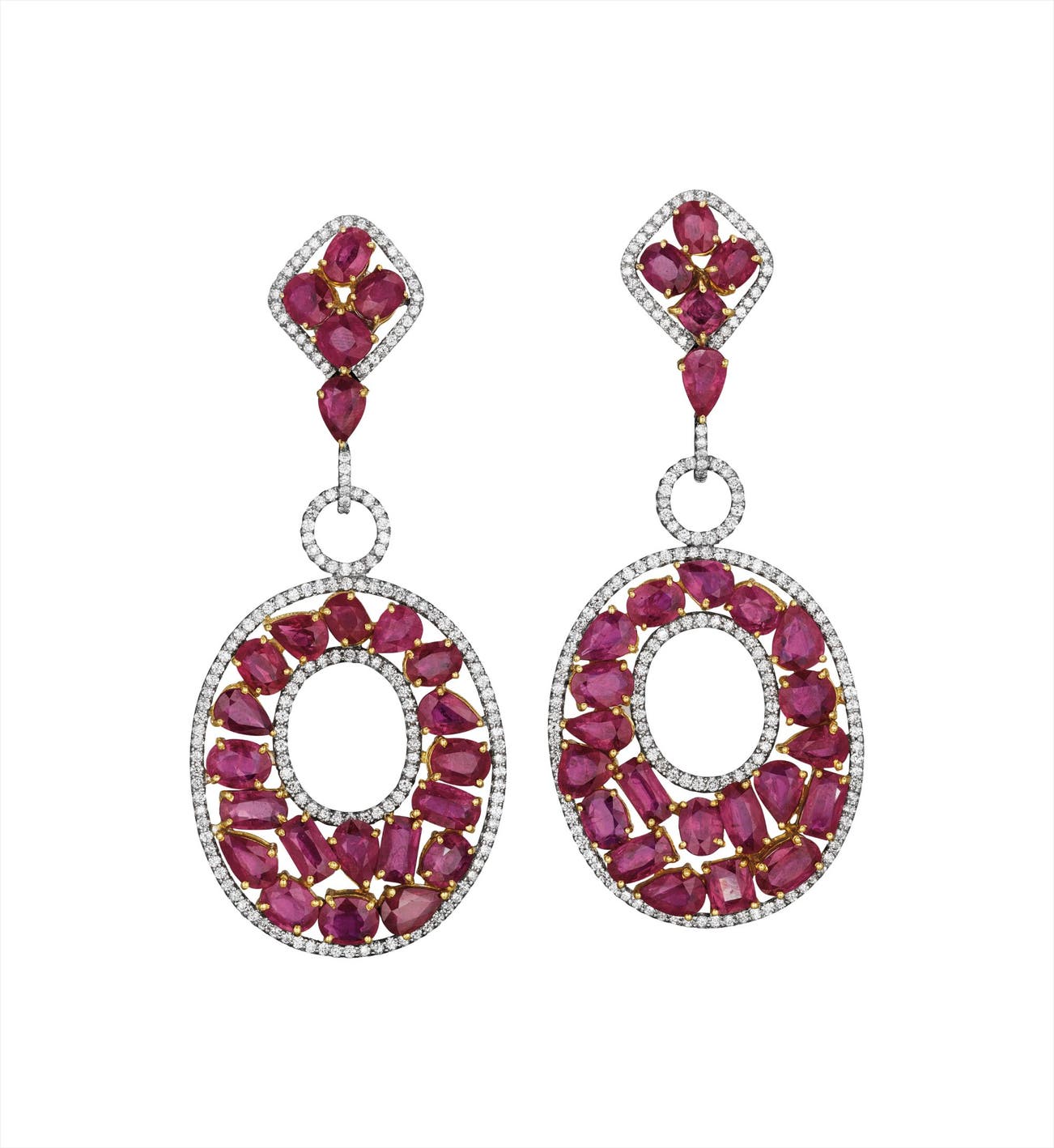 Each suspending a vari-cut ruby oval-shaped plaque, within a pavé-set diamond surround and inner ring, from a pavé-set diamond circular link, to the similarly designed vari-cut ruby cluster surmount, mounted in 18K white and yellow gold, length 3 1/2 inches.