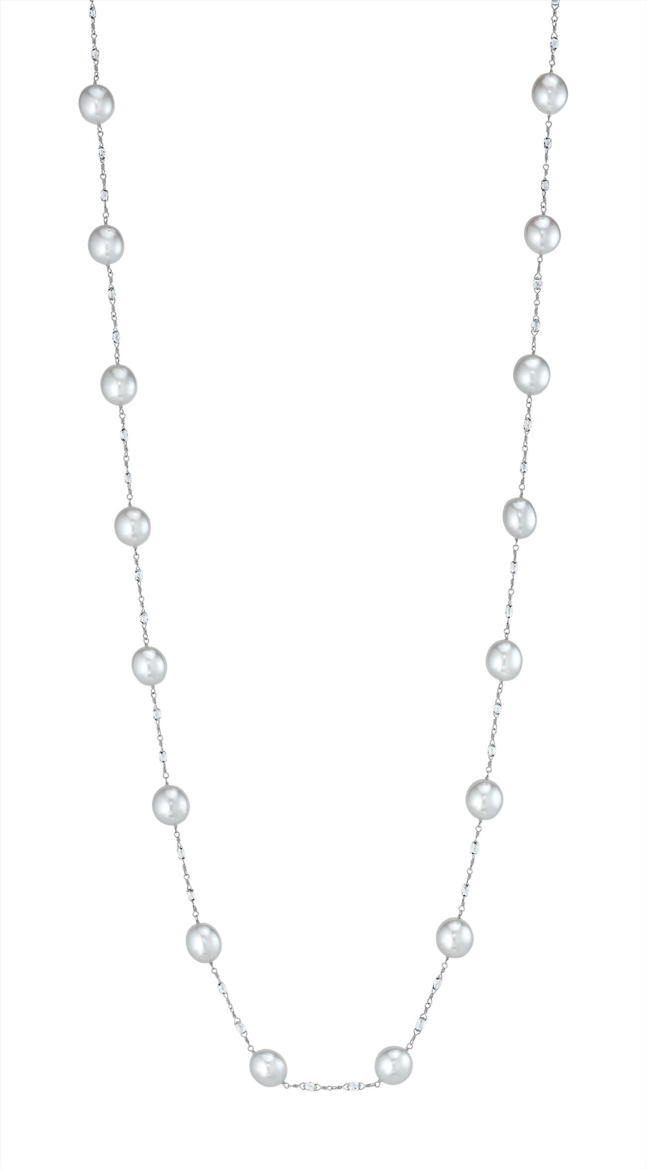 Composed of a series of tweny-three cultured pearls, measuring from approximately 9.18 to 9.95mm, interspersed with a a fine link chain, accented by briolette-cut diamond beads, to the pavé-set diamond clasp, mounted in platinum, length 34 inches.