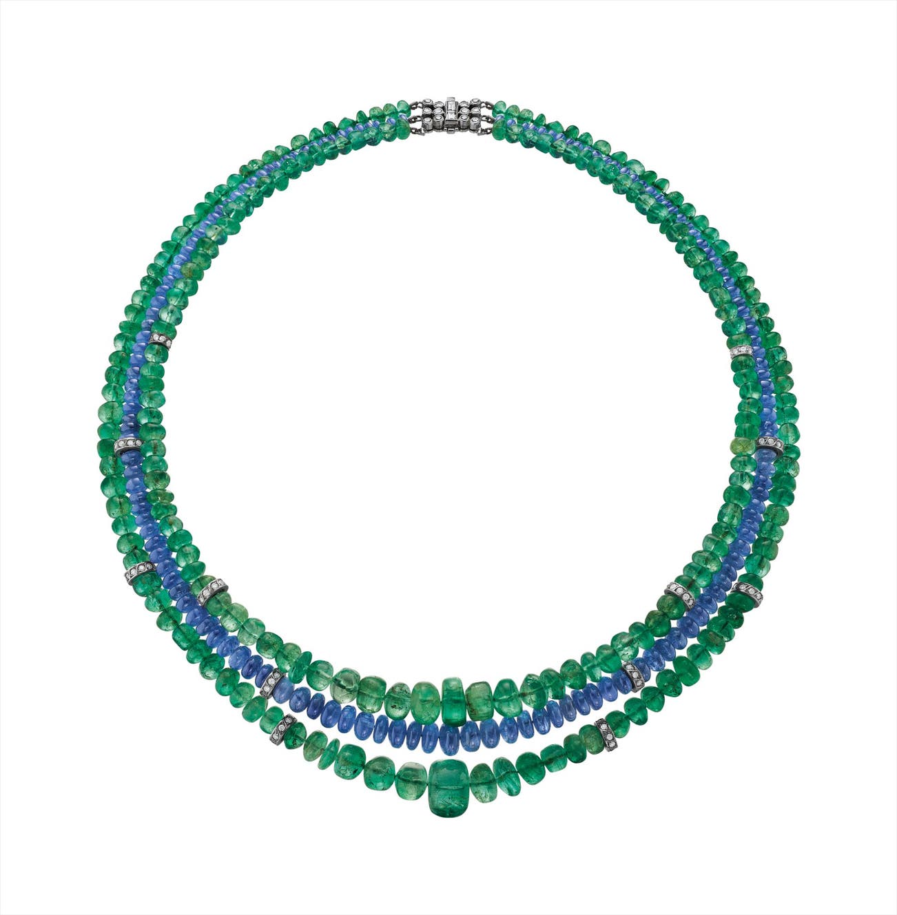 Designed as a three-strand graduated emerald and sapphire bead necklace, accented by pavé-set diamond rondelles, to the collet-set circular and baguette-cut diamond clasp, mounted in platinum, length 16 1/2 and 18 1/2 inches.