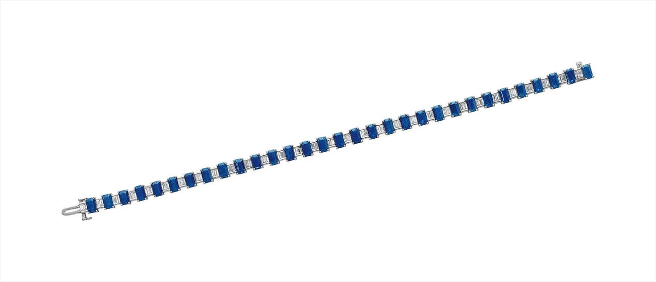 Designed as a line of rectangular-cut sapphires, interspersed with baguette-cut diamonds, mounted in 18K white gold, length 7 inches.