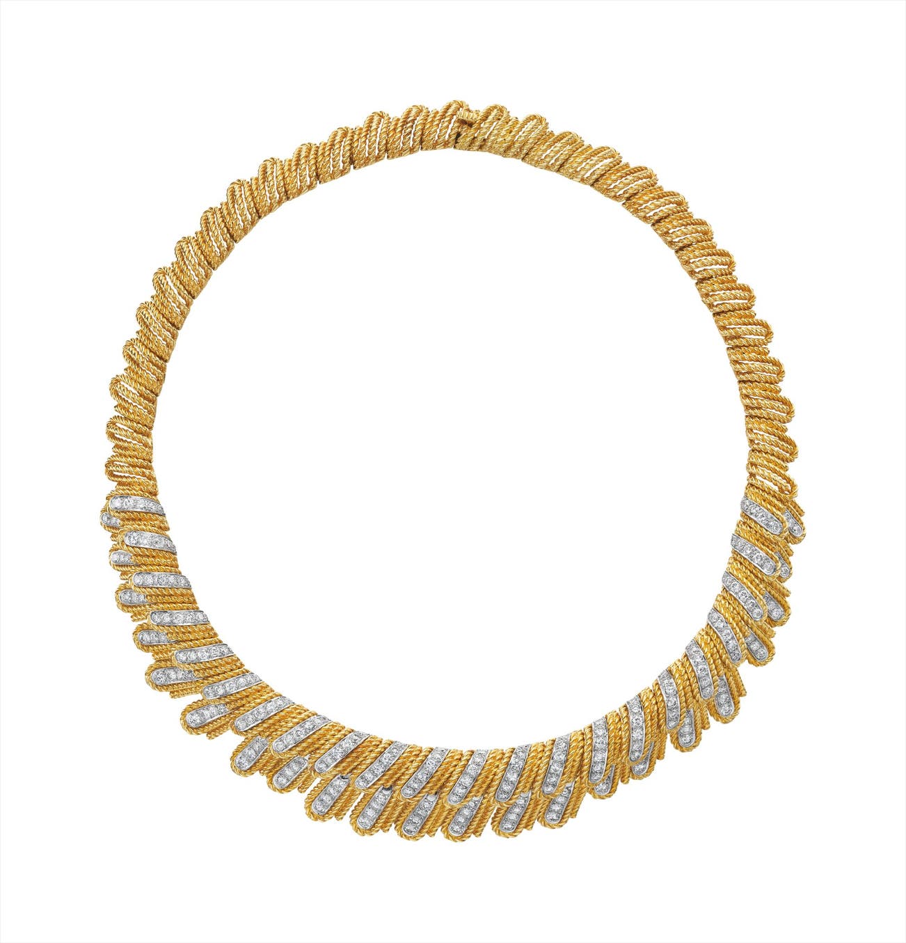 Designed as a graduated rope twist fringe necklace, accented by circular-cut diamond fluted panels, mounted in 18K yellow gold, length 15 1/2 inches.