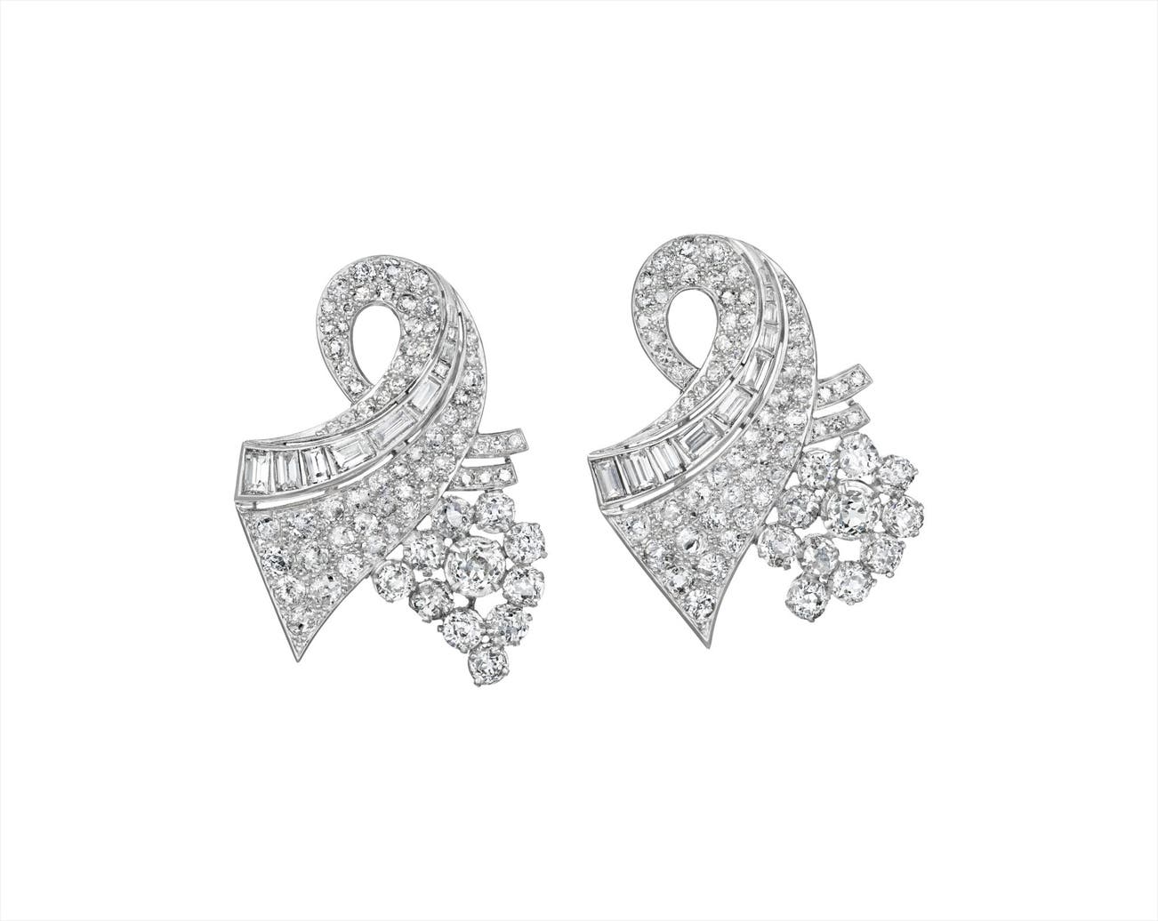 Each designed as a pavé-set diamond scroll, accented by a baguette-cut diamond line, extending upon a cluster of old-cut diamonds, mounted in platinum, length 1 1/2 inches.