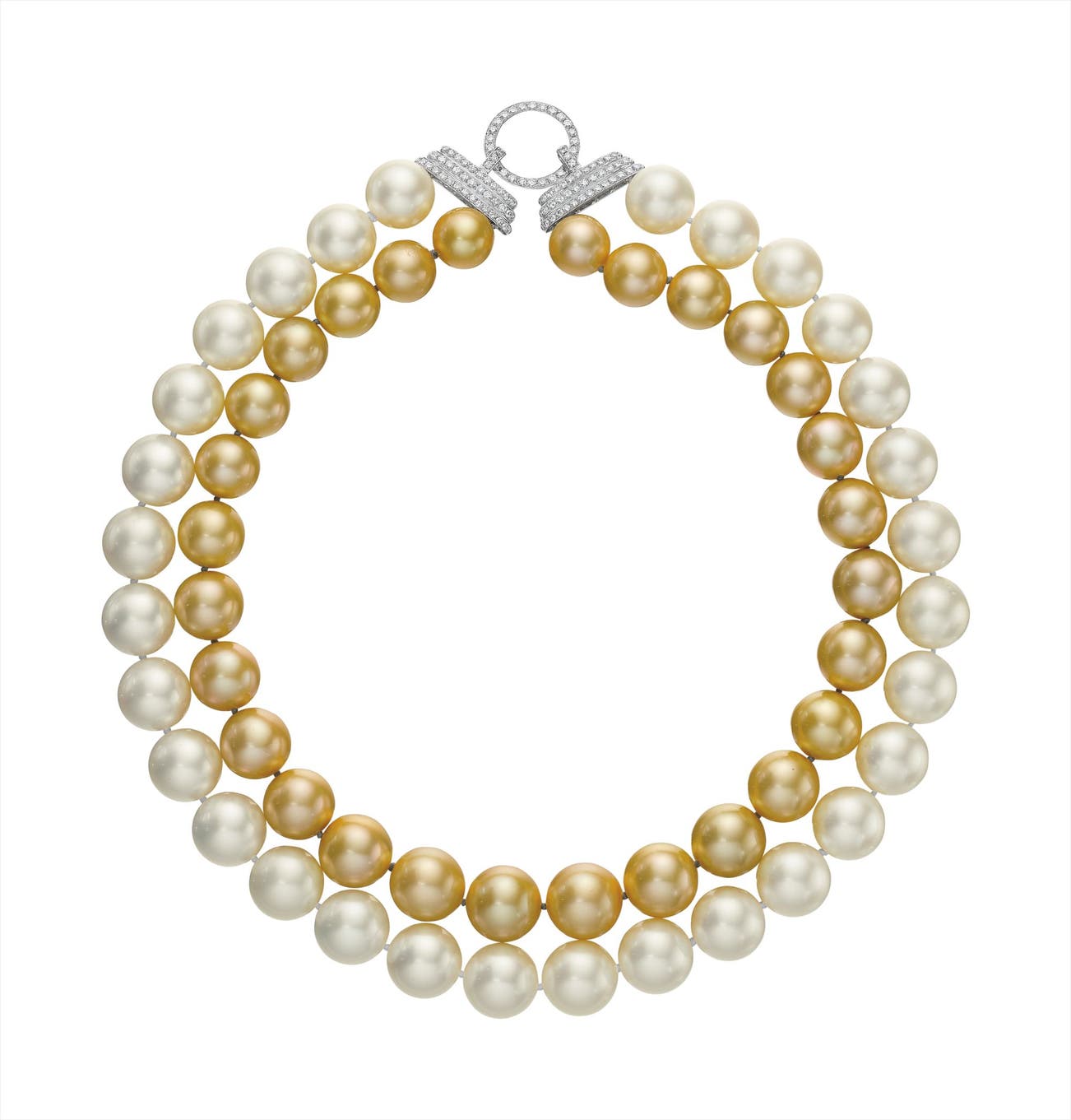 Designed as two graduated strands of South Sea and Golden South Sea cultured pearls, measuring from approximately 12.48 to 15.18 mm, joined by a circular-cut diamond hook clasp, mounted in 18K white gold, length 18 to 20 inches.