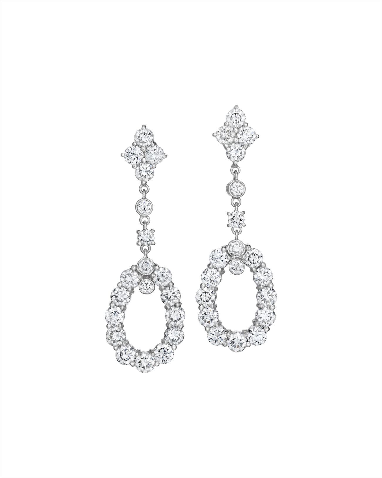 Each designed as a circular-cut diamond pear-shaped drop, from a circular-cut diamond spacer link, to the circular-cut diamond cluster surmount, mounted in 18K white gold, length 1 7/8 inches.