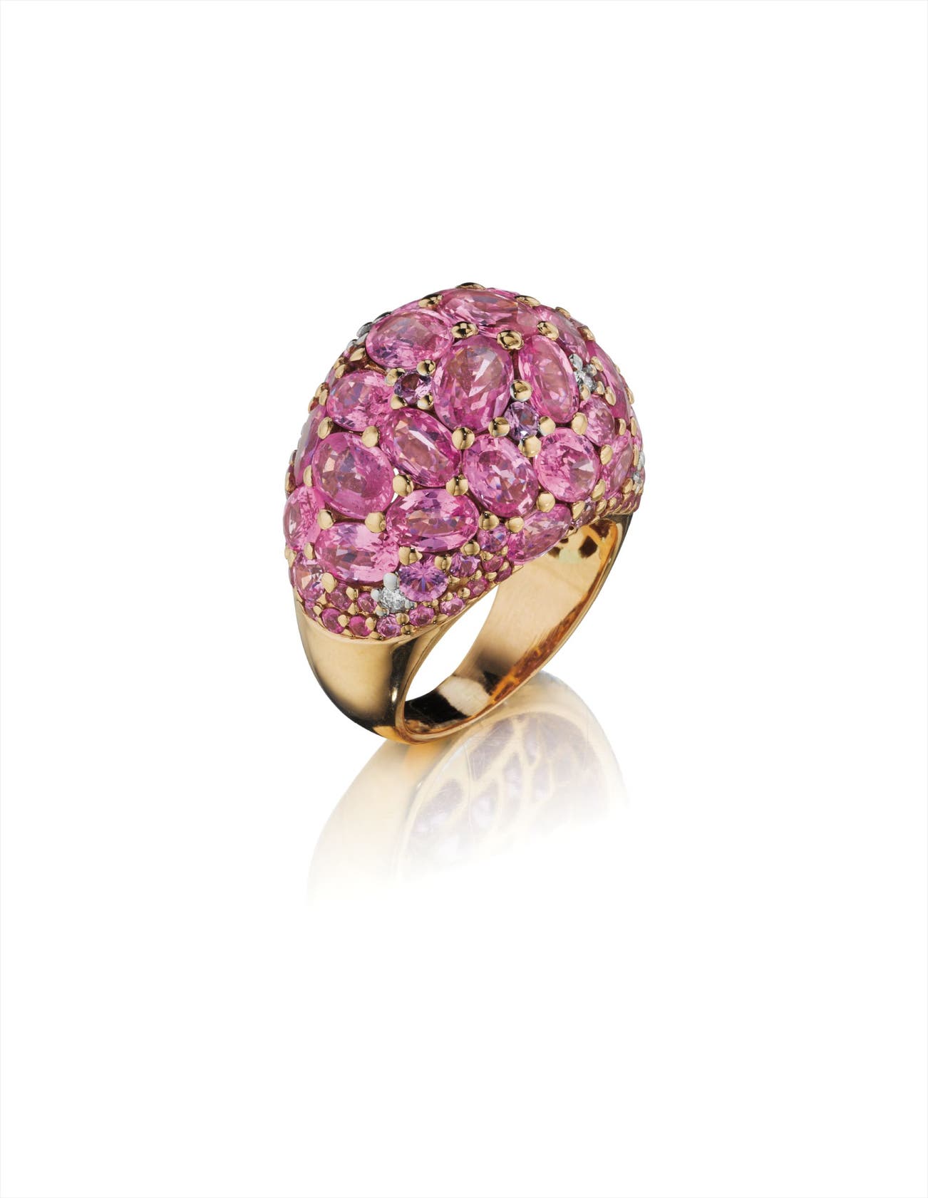 Designed as an oval and circular-cut pink sapphire bombé ring, accented with circular-cut diamonds, mounted in 18K rose gold, size 7 3/4.